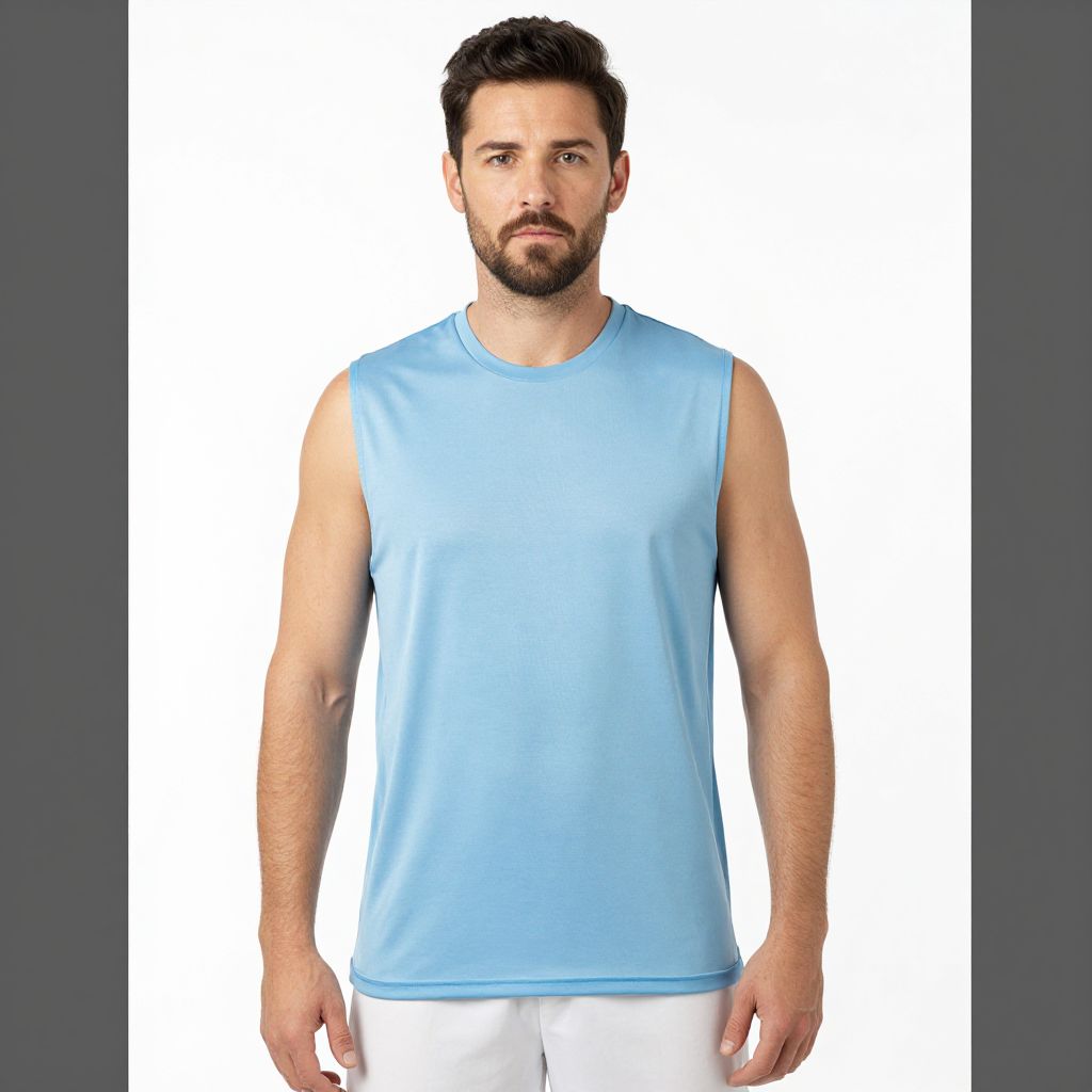 Photograph of a muscular, bearded Caucasian man with short dark brown hair, standing against a white background. He wears a light blue sleeveless athletic shirt that fits snugly, highlighting his toned arms, and white pants. His expression is neutral, and he looks directly at the camera. The image has a clean, minimalistic style with a dark gray border on both sides, framing the subject. The lighting is even, emphasizing the smooth texture of his skin and the fabric of his shirt.
