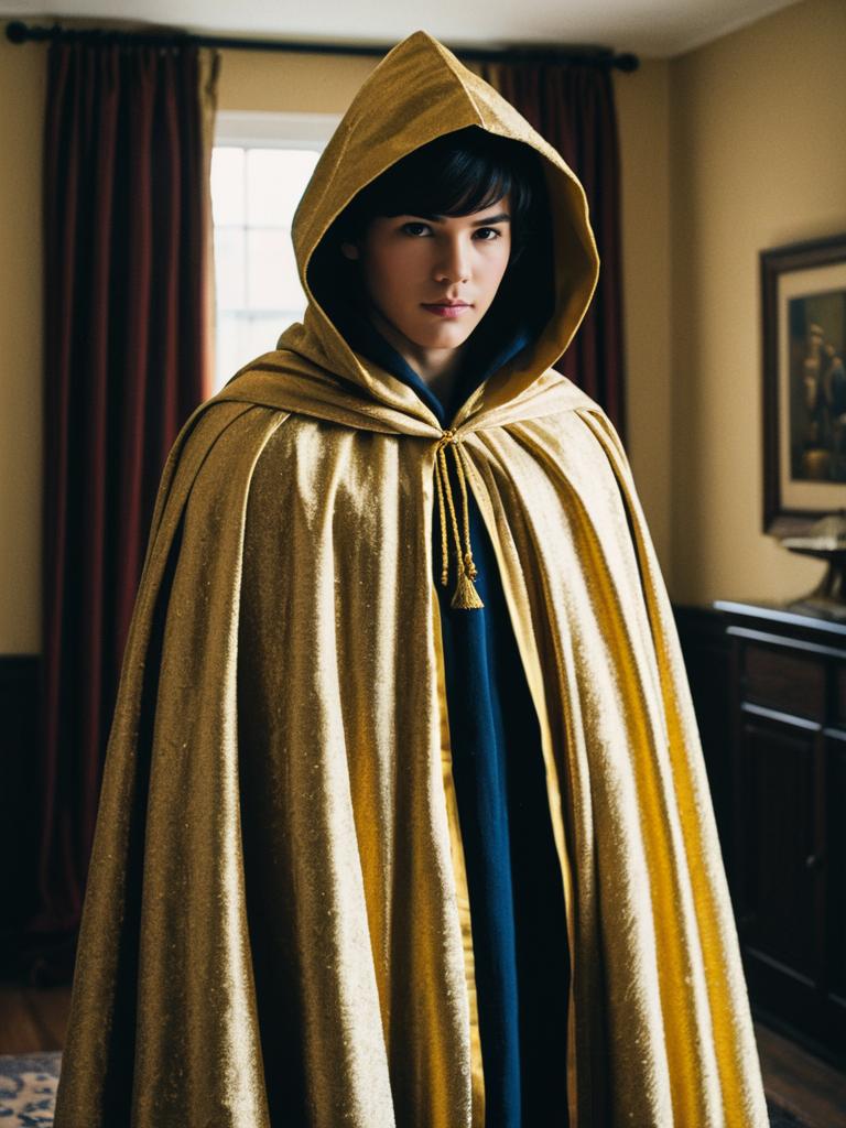 Gold cape costume, 1boy, solo, male focus, looking at viewer, hood, robe, hood up, indoors, standing, cloak, black hair