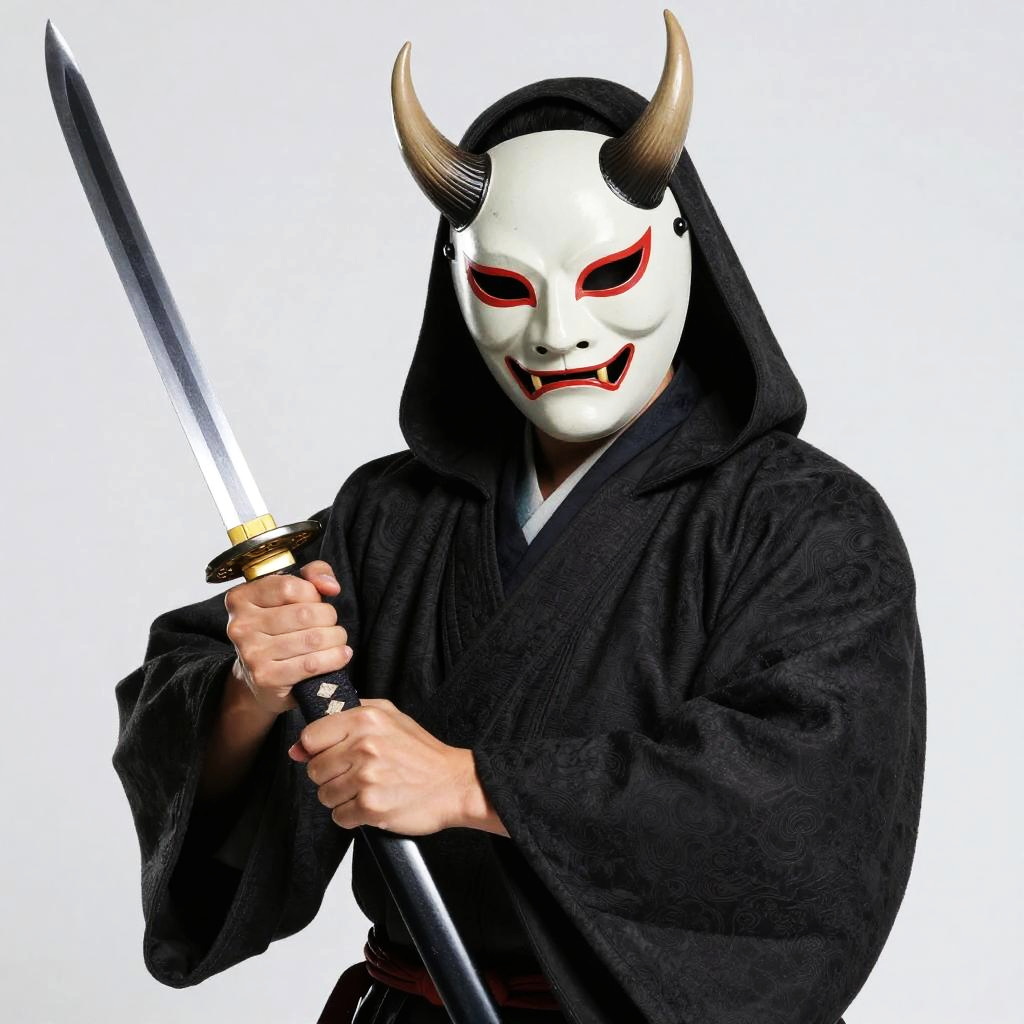 Photograph of a person wearing a white mask with red accents, black horns, and a black hooded robe, gripping a shiny katana with a golden hilt. The mask features a sinister smile with red eyes. The person's hands, visible through the robe's sleeves, are holding the katana's hilt firmly. The background is plain white, highlighting the subject. The image has a sharp, high-contrast style, emphasizing the dramatic and mysterious appearance of the masked figure. The overall composition conveys a sense of readiness and intimidation.