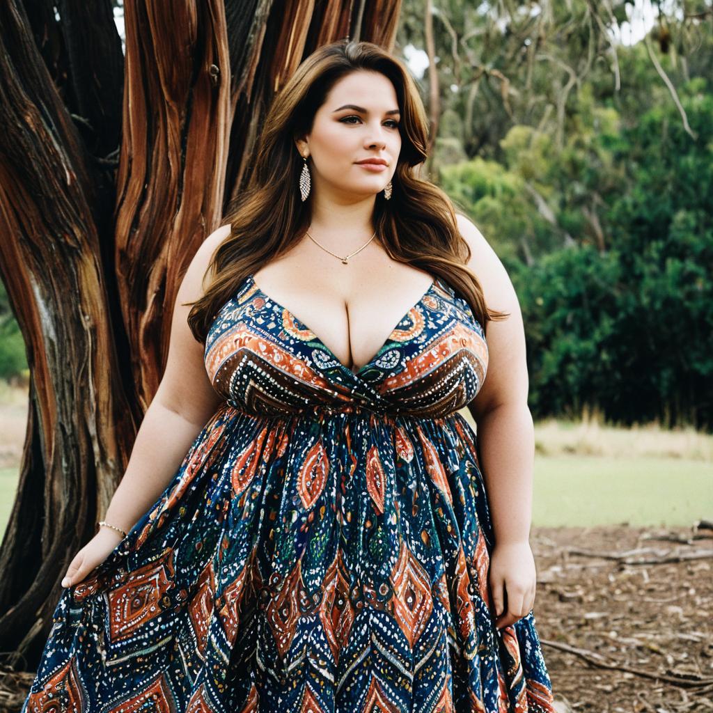 Australian plus size,1girl, solo, dress, breasts, brown hair, jewelry, fat, earrings, plump, large breasts, long hair, tree, multicolored clothes, outdoors, cleavage
