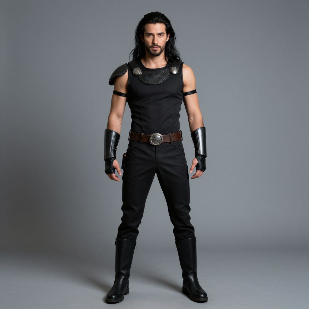 Milo atlantis costume, 1boy, male focus, solo, long hair, facial hair, standing, black hair, boots, beard, looking at viewer, bracer