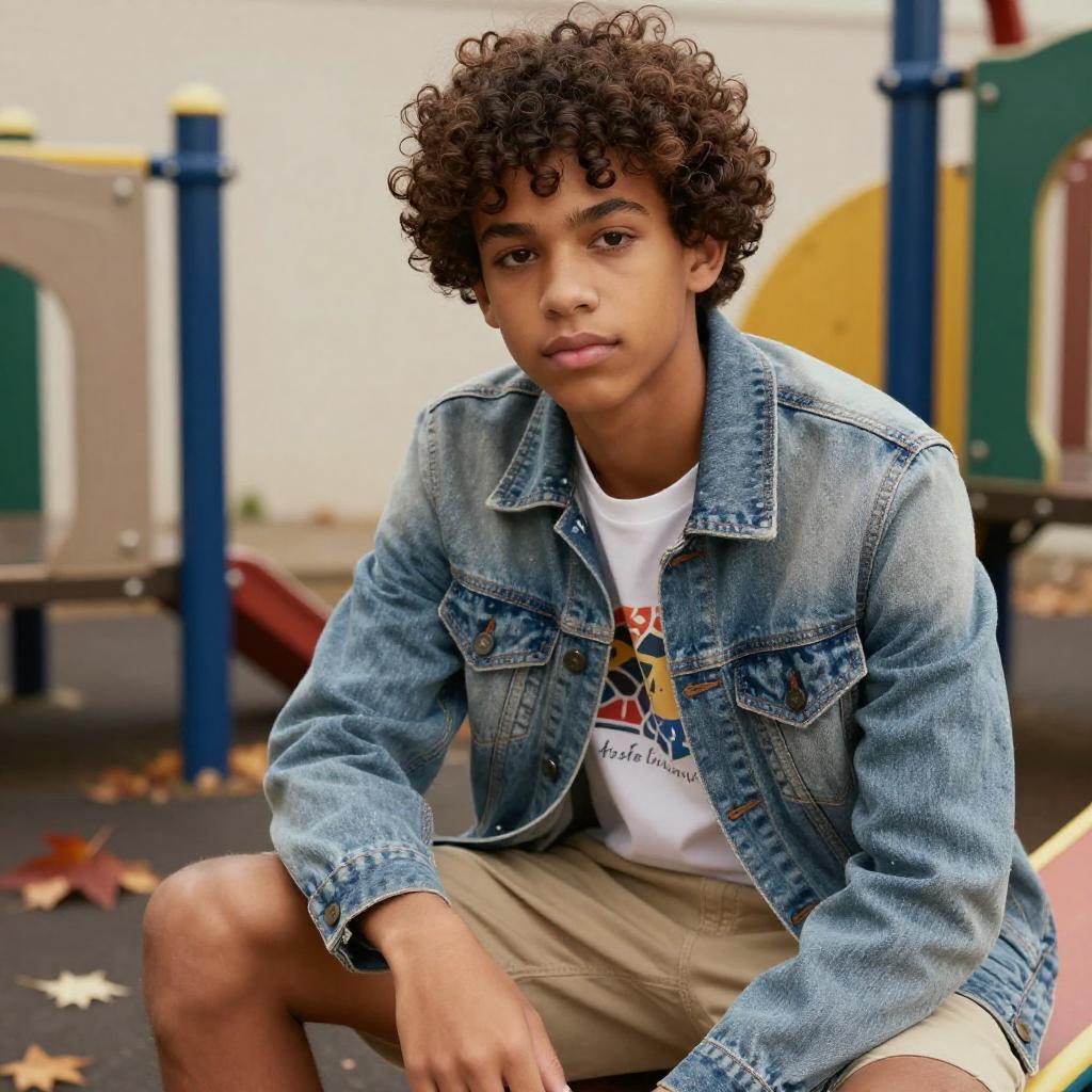 Photograph of a smiling young boy with curly hair, wearing a colorful patterned shirt and blue jeans, standing in a bright kitchen with white cabinets and