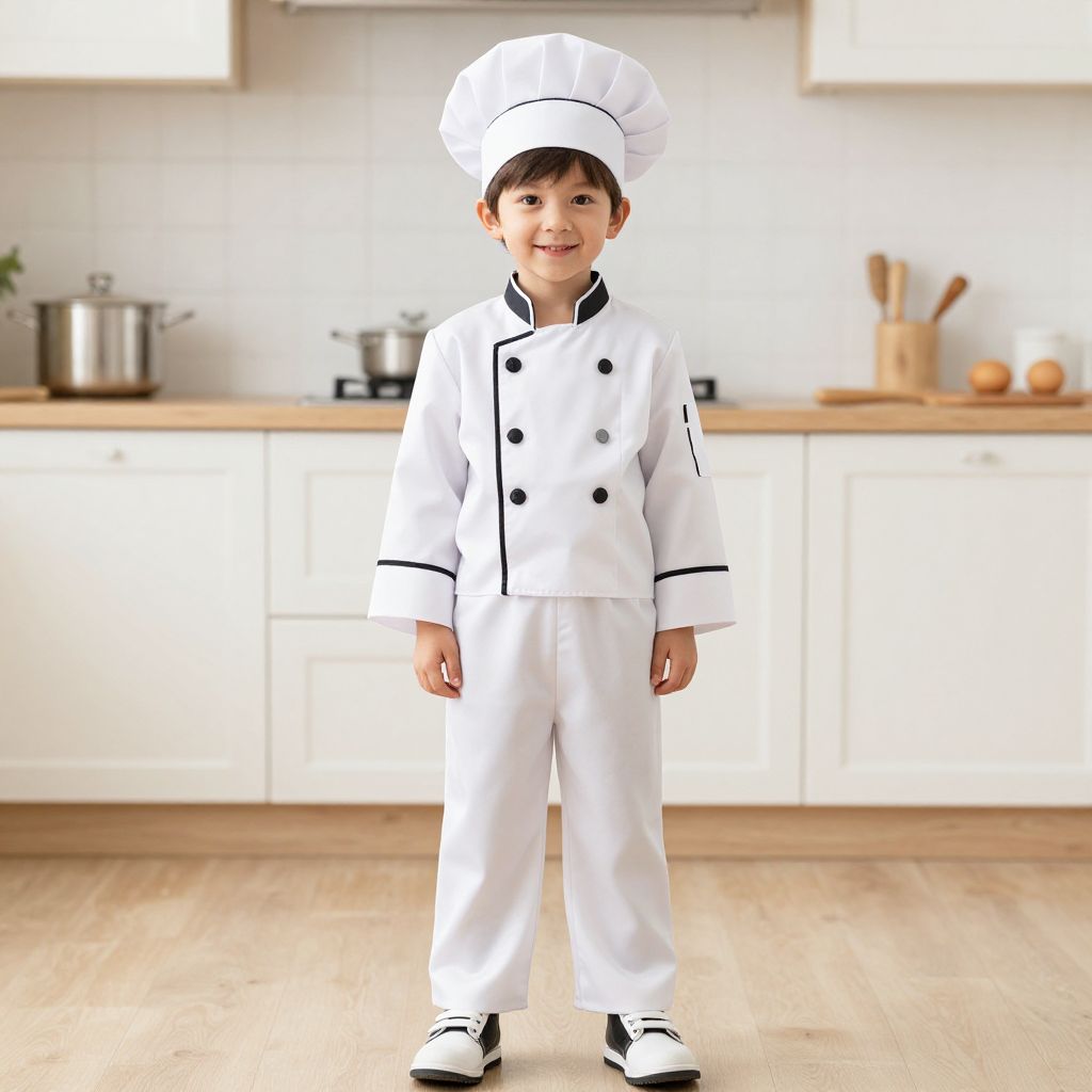 Photograph of a smiling young boy in a white chef's uniform and hat, standing in a bright, modern kitchen.