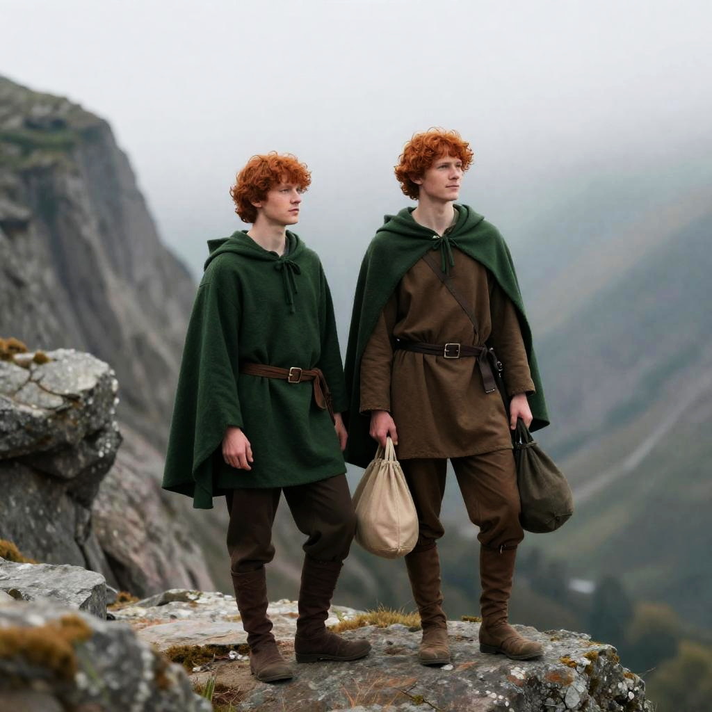 Two young men with curly red hair, wearing green cloaks and brown tunics, stand on a rocky mountain ledge. The man on the right holds a bag, has a green cloak over his shoulder, and looks ahead. The man on the left looks slightly to the side. Jagged rocks and misty mountains in the background.