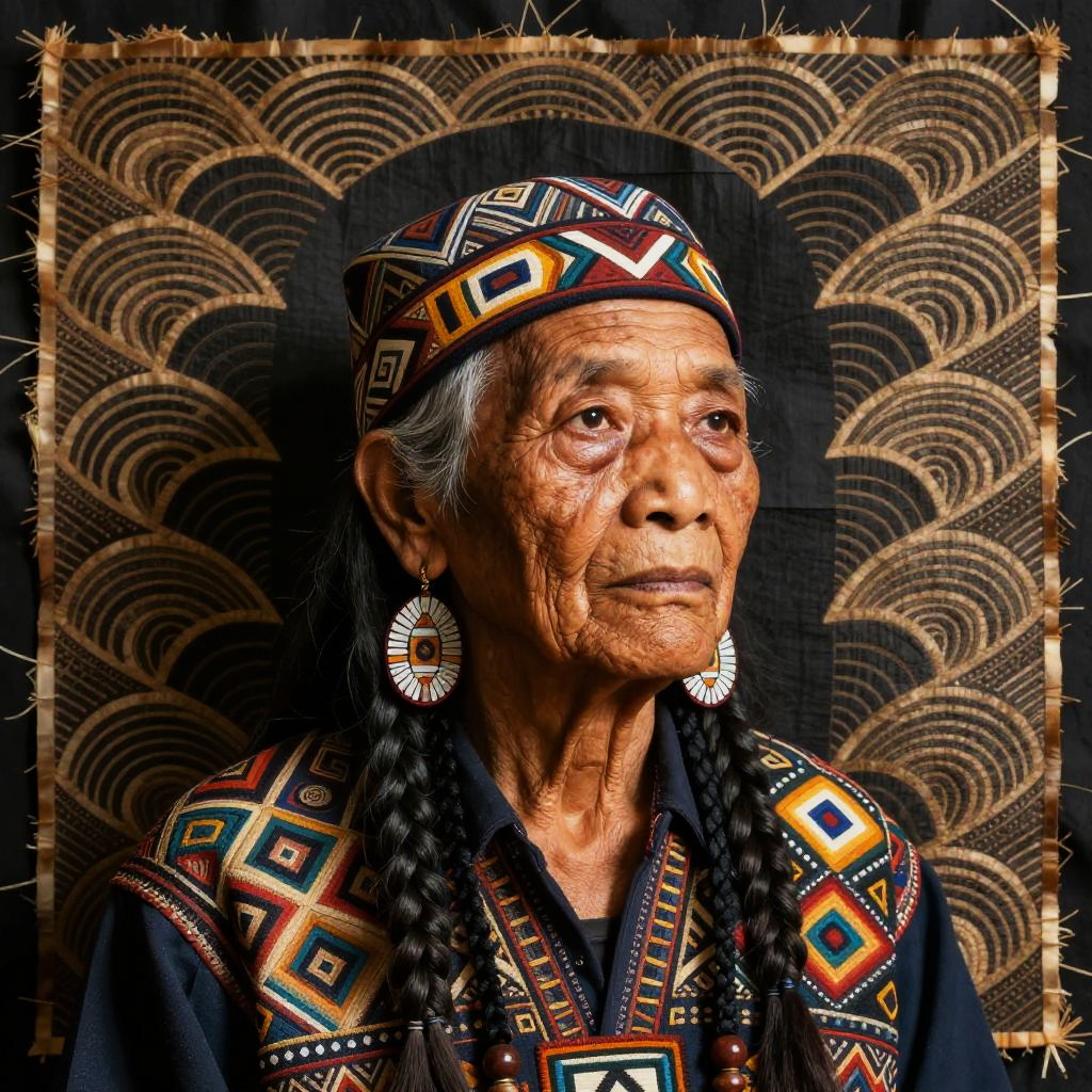 Surrealism masterpiece featuring a Native Hawaiian elder, intricate Kapa bark cloth wave patterns, rendered in super realism with vivid geometric designs, bold colors, and lifelike details.