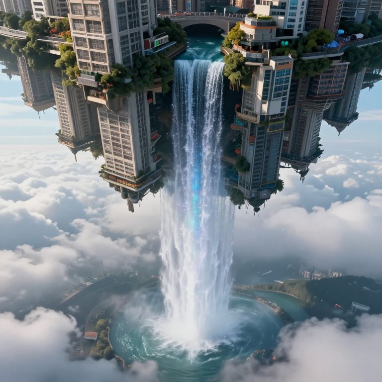 A levitating city floats upside-down above the clouds, with gravity-defying rivers cascading skyward into waterfalls of stardust.