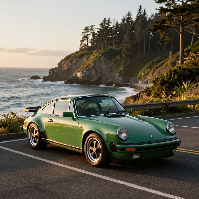 944 Porsche parked on a coastal highway overlooking the ocean, deep forest green color, classic 1980s sports car styling, shiny chrome wheels, sunset lighting casting long shadows, ultra-detailed digital art with emphasis on sleek lines and reflections