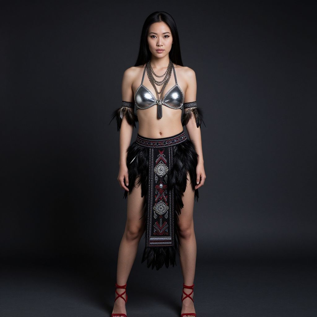 Photograph of an Asian woman with long black hair, wearing a metallic silver bra and black feathered skirt with intricate patterns. She has multiple layered necklaces and feathered arm accessories. Her skin is fair, and she's standing against a plain dark gray background, wearing red strappy heels. The overall look is tribal-inspired and exotic.