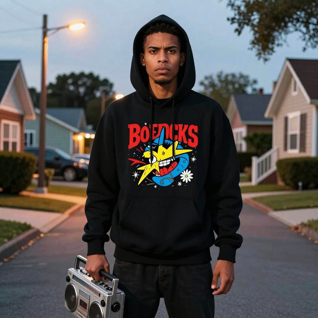Hood custom boondocks character, intense and confident, wearing a black hoodie with unique graphic prints, holding a boombox in a suburban neighborhood, dusk atmosphere with warm streetlights, mix of realism and animation, vivid color palette, intricate background elements.