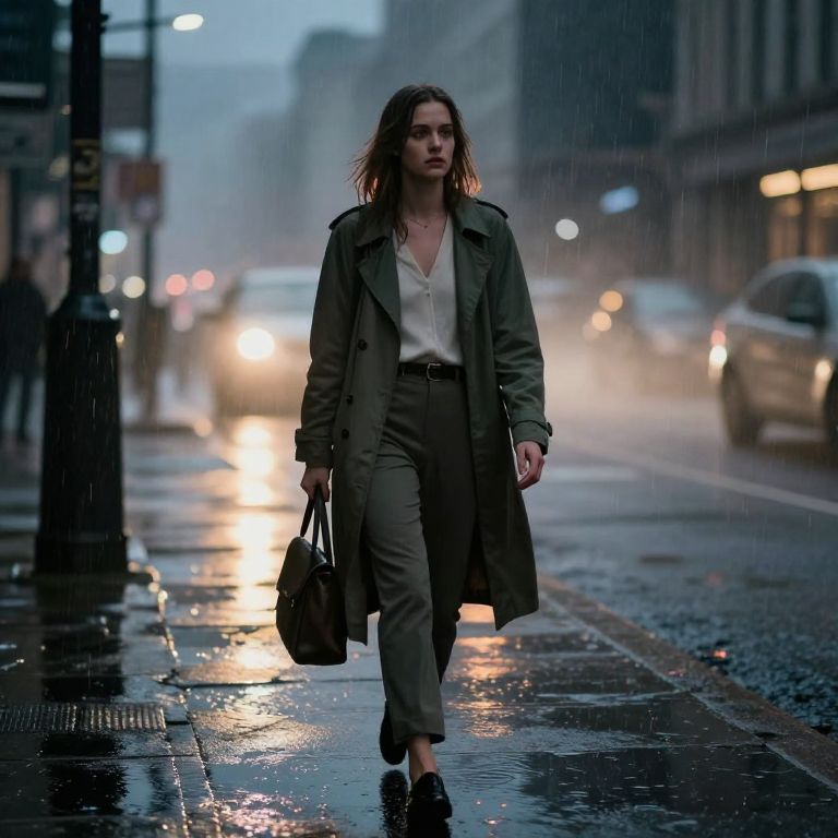 Natalia Dyer AI: A cinematic AI-generated scene showing Natalia Dyer in a rainy urban evening, wearing a modern outfit, reflected in wet pavement, dynamic lighting, and atmospheric fog, with a mood of introspection and melancholy.