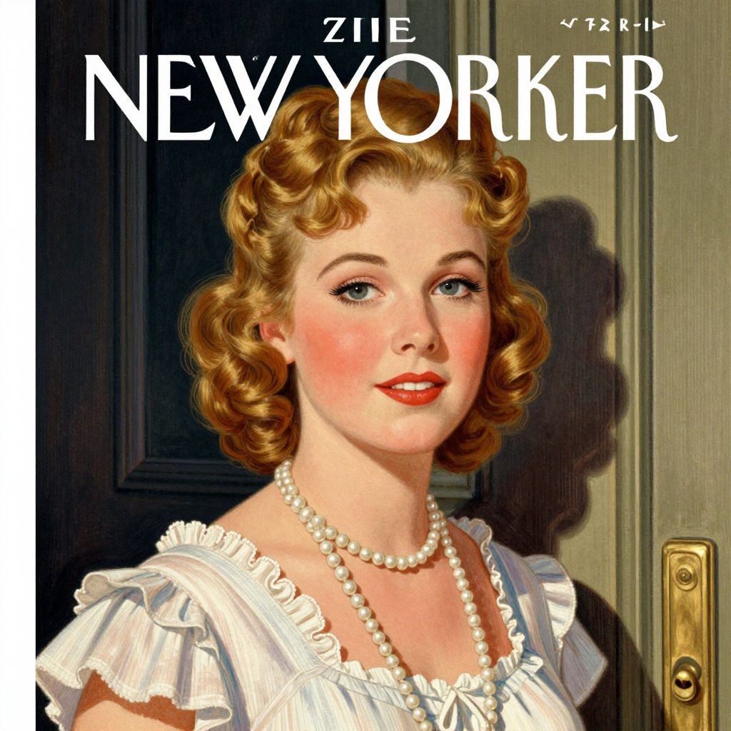 A vintage-style illustration reminiscent of mid-20th century New Yorker magazine covers, featuring a woman with golden curls and rosy cheeks, adorned in a pearl necklace and a ruffled blouse, set against a classic door backdrop with dramatic lighting, evoking the nostalgic charm of Charles E. Martin's artwork.