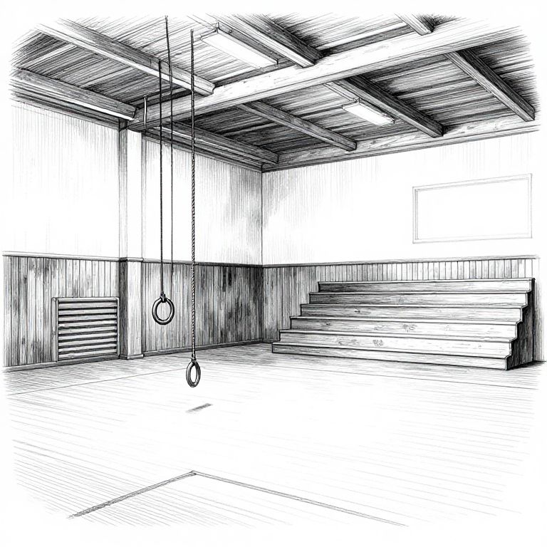 School gym drawing, black and white ink illustration of an old school gym, vintage gymnastic rings, climbing ropes, wooden bleachers, high ceiling with exposed beams, nostalgic mood, fine line details