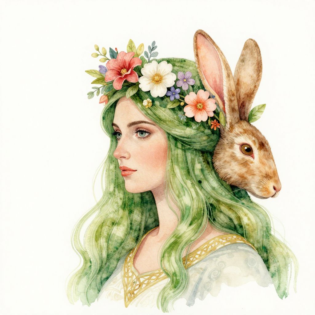 A watercolor painting of a woman with long green hair, adorned with a floral crown and a rabbit's head, symbolizing the Celtic goddess Eostre associated with spring and fertility.