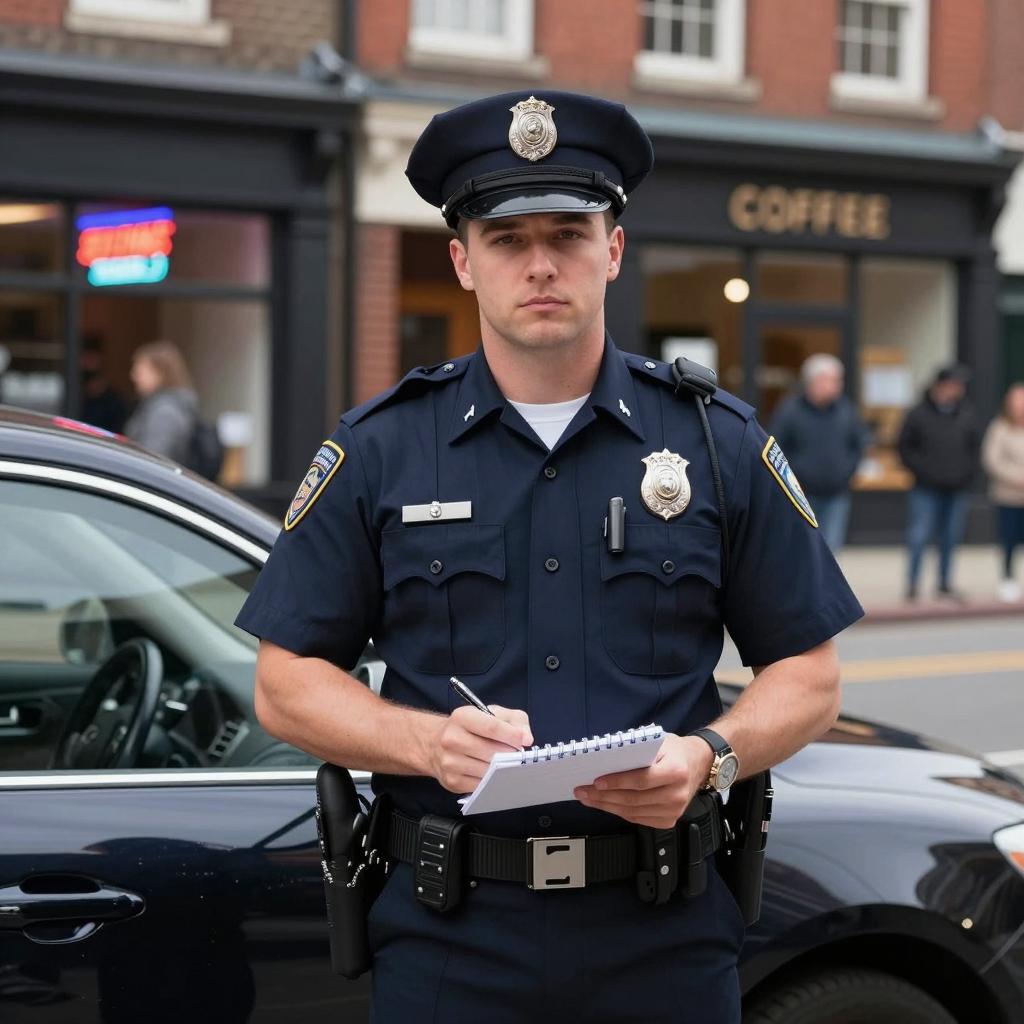 A focused Black male police officer in a blue uniform and cap labeled 'SANCHEZ' is holding a corded phone to his ear. In the background, three men wearing military-style tactical gear stand blurred. The image conveys a serious, indoor law enforcement setting.