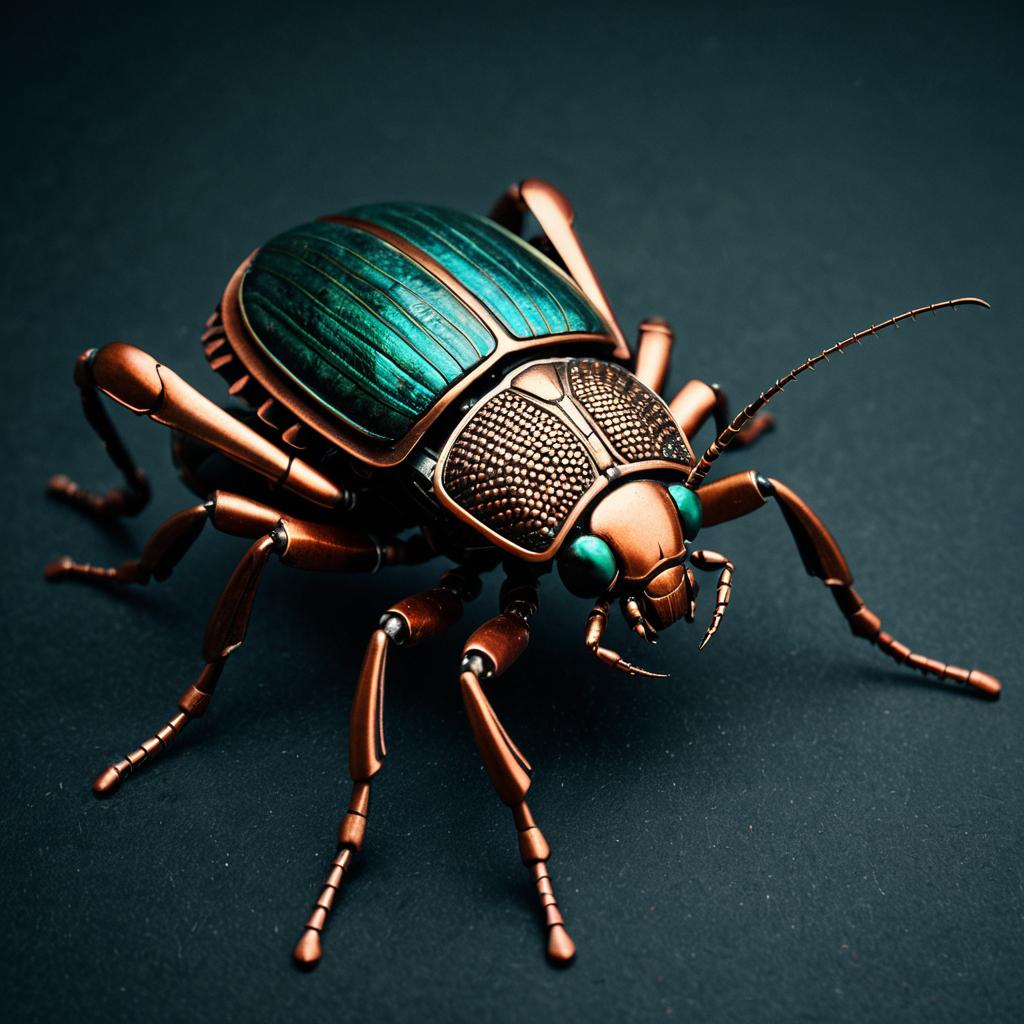A mechanical insectoid with a copper and dark bronze color palette, based on scarab beetles, showcasing an exotic design and intricate scales.