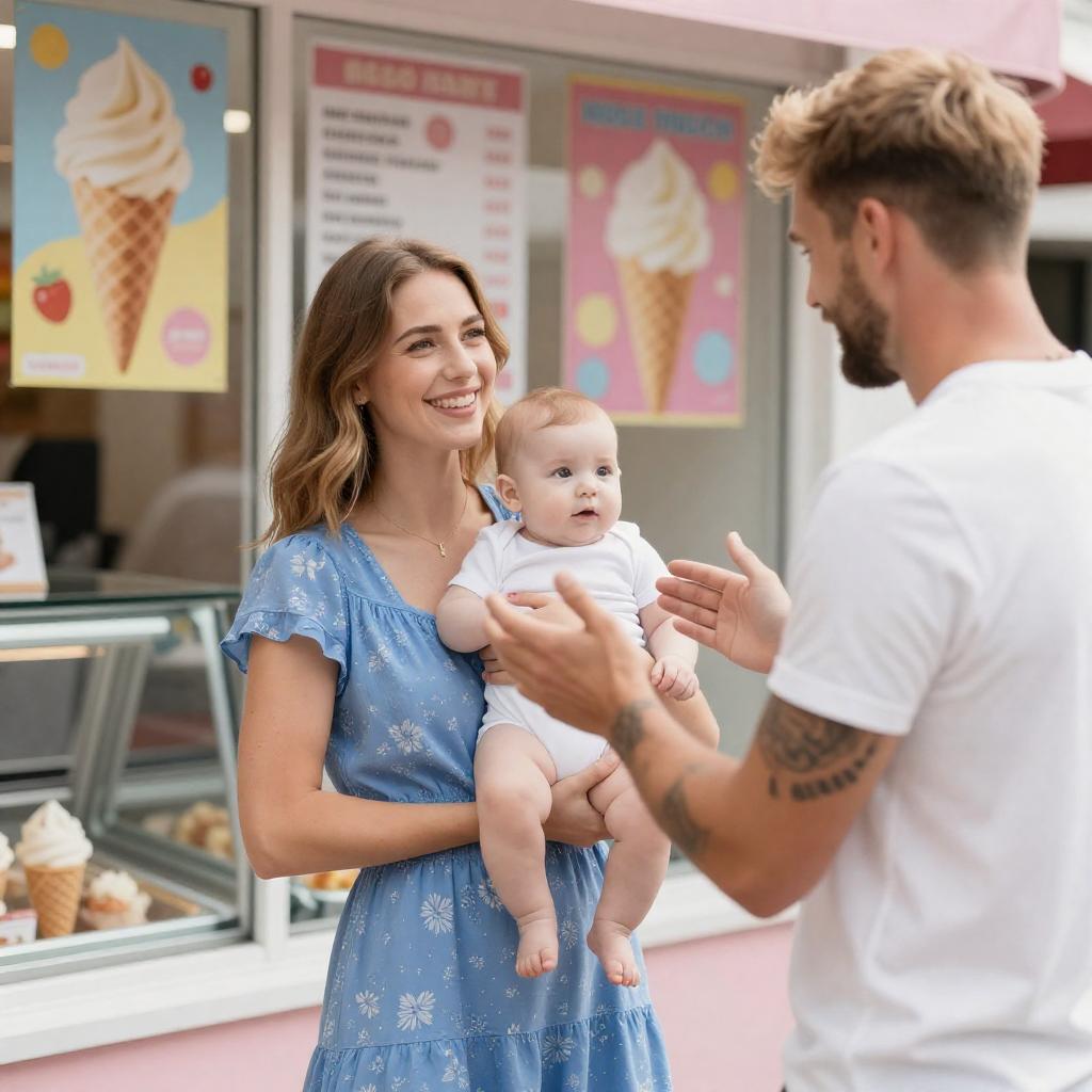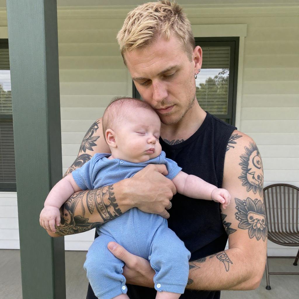 Photograph of a family of three. Tattooed man with blond hair, white t-shirt, holding baby in white outfit, baby's arm raised. Woman with dark hair, blue floral dress, leaning on man's shoulder, looking down. Outdoor setting, wooden table, house and trees in background.