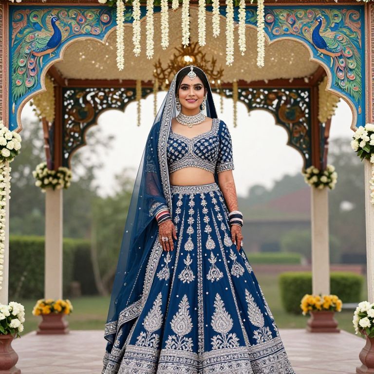 A graceful bride in a rich blue lehenga choli with intricate silver zari work, standing under a marquee adorned with peacock motifs and blooming jasmine flowers; she has fair skin, large expressive eyes, and a serene smile, her hands resting on the train of the lehenga as she looks into the camera.