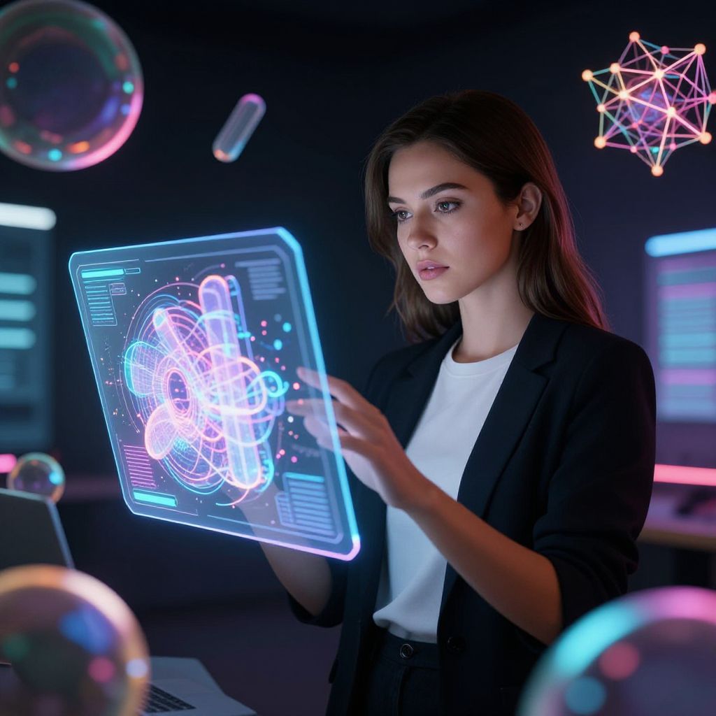Corporativo businesswoman giving presentation using holographic interface, advanced technology setting, futuristic corporate building backdrop, expressive confident body language, glowing charts and graphs, high detail, immersive and inspiring composition