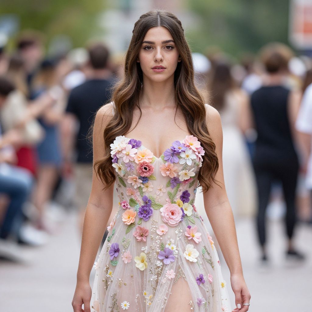 Greatest showman fancy dress, 1girl, solo, dress, long hair, brown hair, flower, looking at viewer, breasts, blurry, floral print, blurry background, outdoors