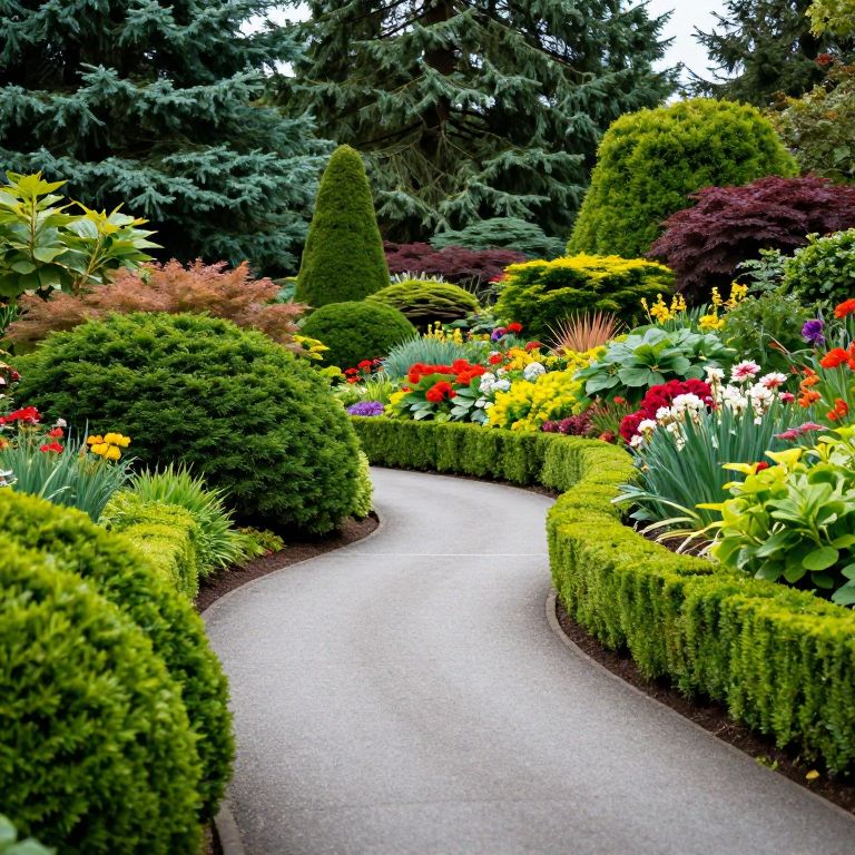 Winding asphalt pathway meanders through vibrant, meticulously manicured gardens featuring lush green shrubs, colorful flowering plants, and towering evergreen trees, creating a serene and picturesque scene reminiscent of Butchart Gardens in Vancouver.