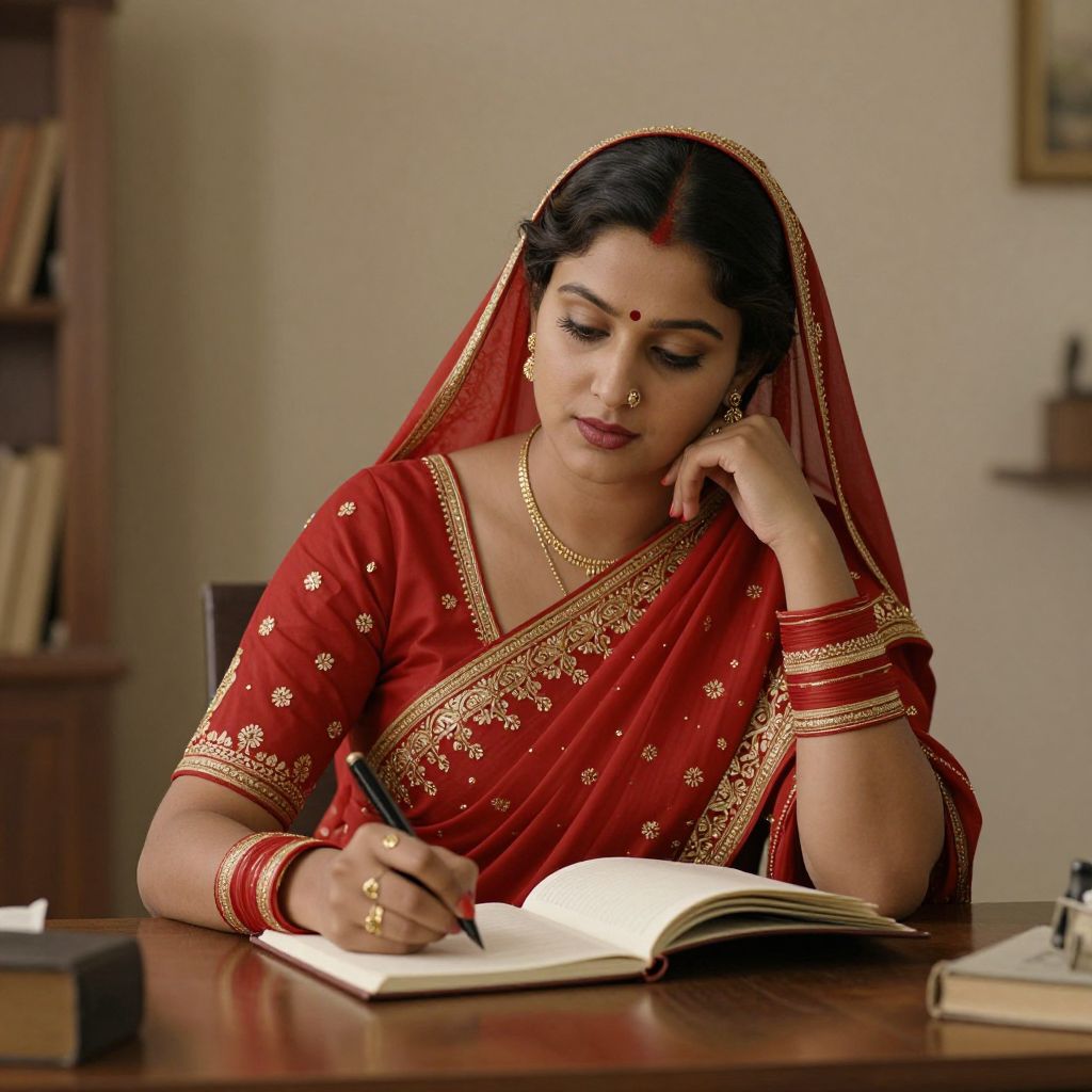 A classical-style portrait depicts a woman in a vibrant red sari adorned with intricate gold embroidery, seated at a wooden desk and writing in an open notebook, evoking a timeless, high-definition artistic rendering that reflects themes of intellectual pursuit and social reform.