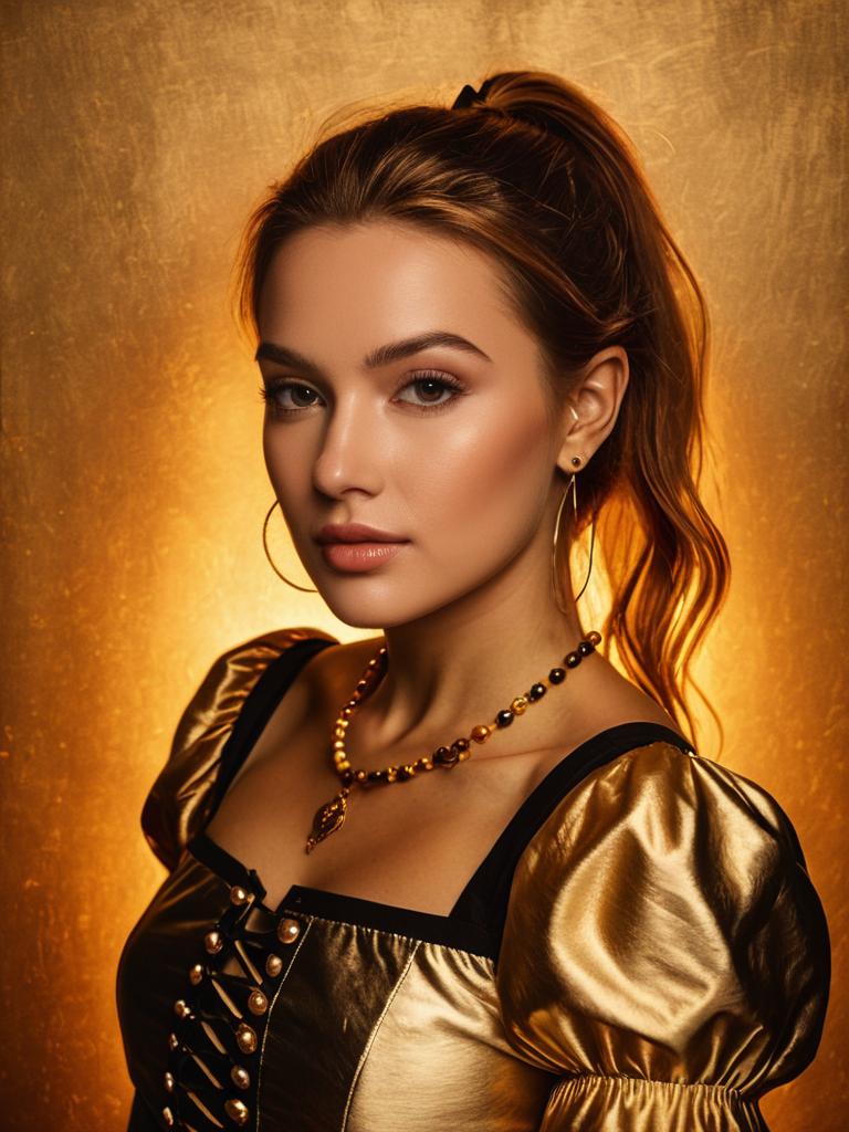Portrait of a young woman with long wavy auburn hair wearing a shiny metallic gold long-sleeve top. The background features a textured warm golden hue that complements her outfit and hair color. The woman's expression is neutral and confident, looking directly into the camera.