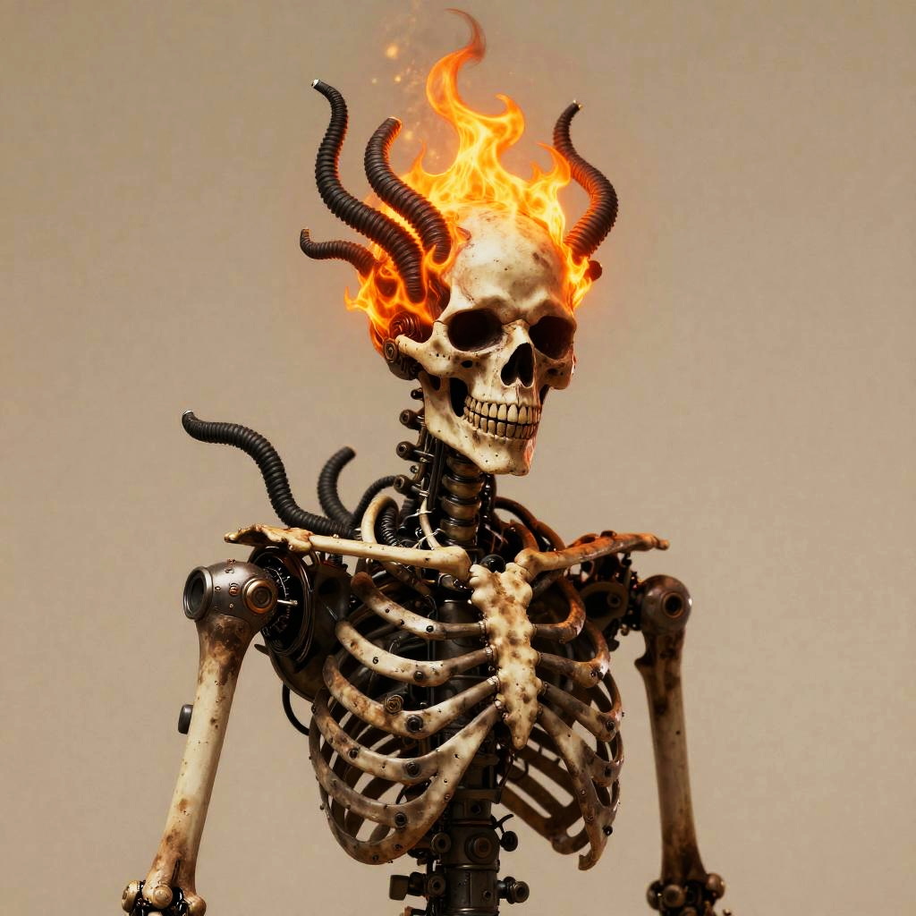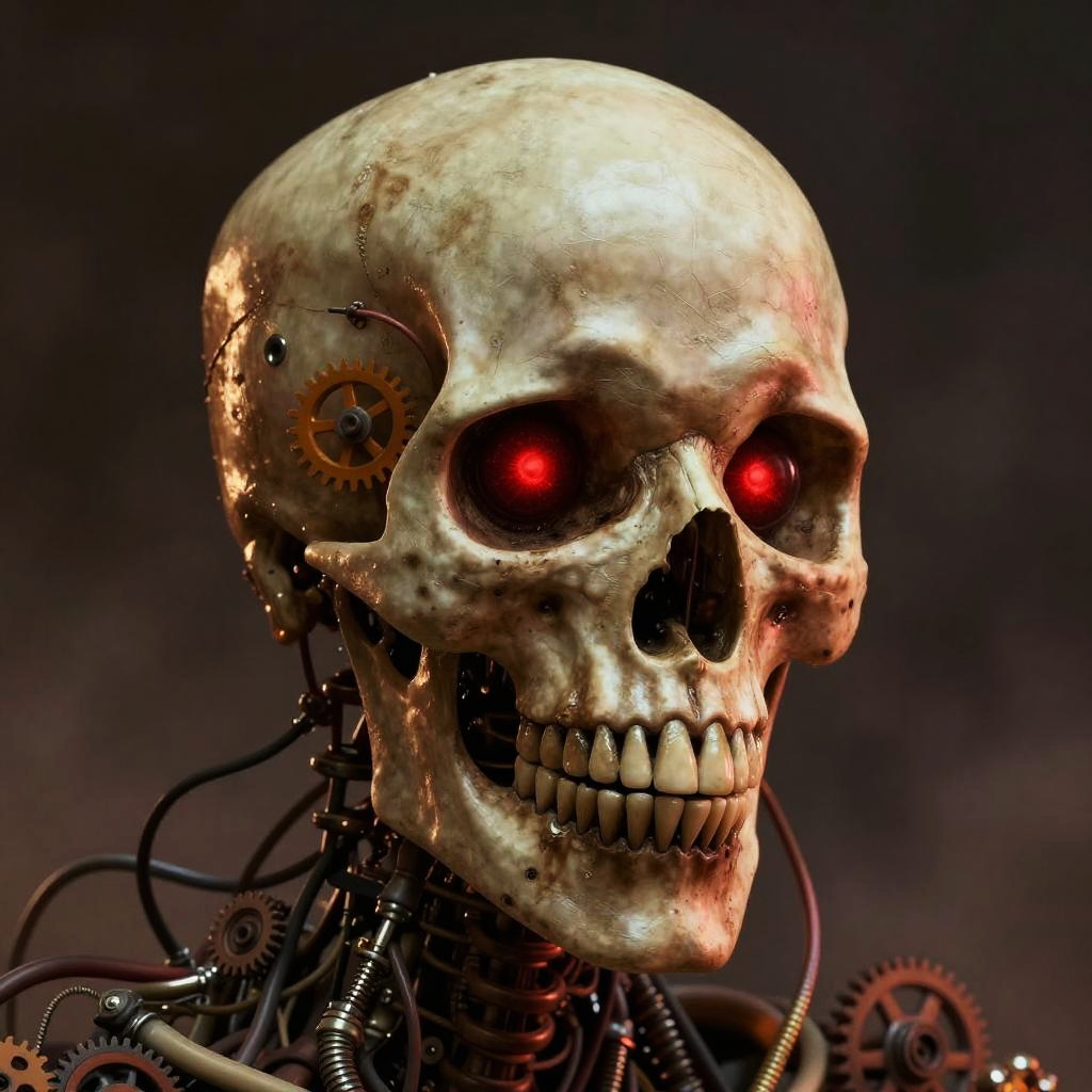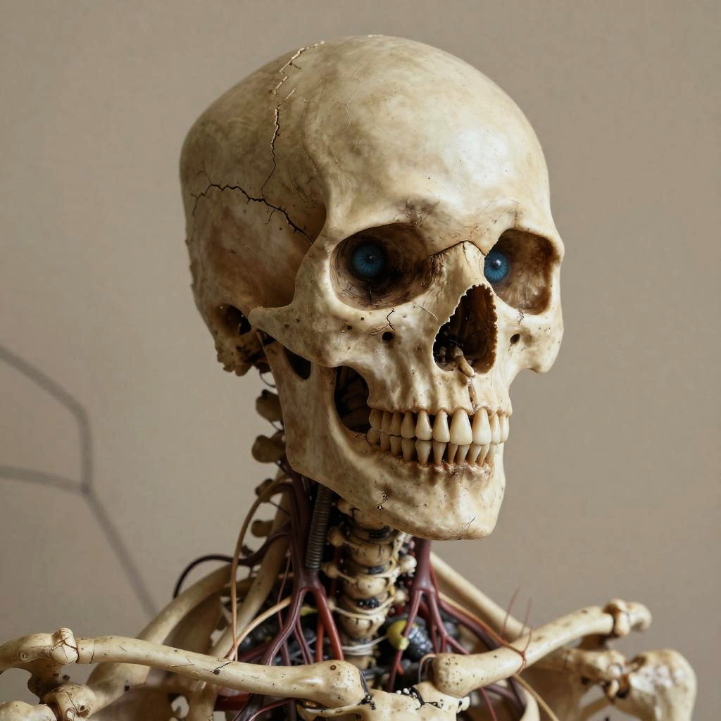 This digital artwork depicts a creepy, realistic human skull with cracked bones and exposed veins, especially noticeable around the neck and shoulders. The eyes have a haunting, lifeless blue color, and the mouth is slightly open with visible teeth. The background is a muted beige with dark, branching lines that add to the eerie atmosphere. The overall style is hyper-realistic, with a focus on detailed anatomy and a spooky, unsettling feel.