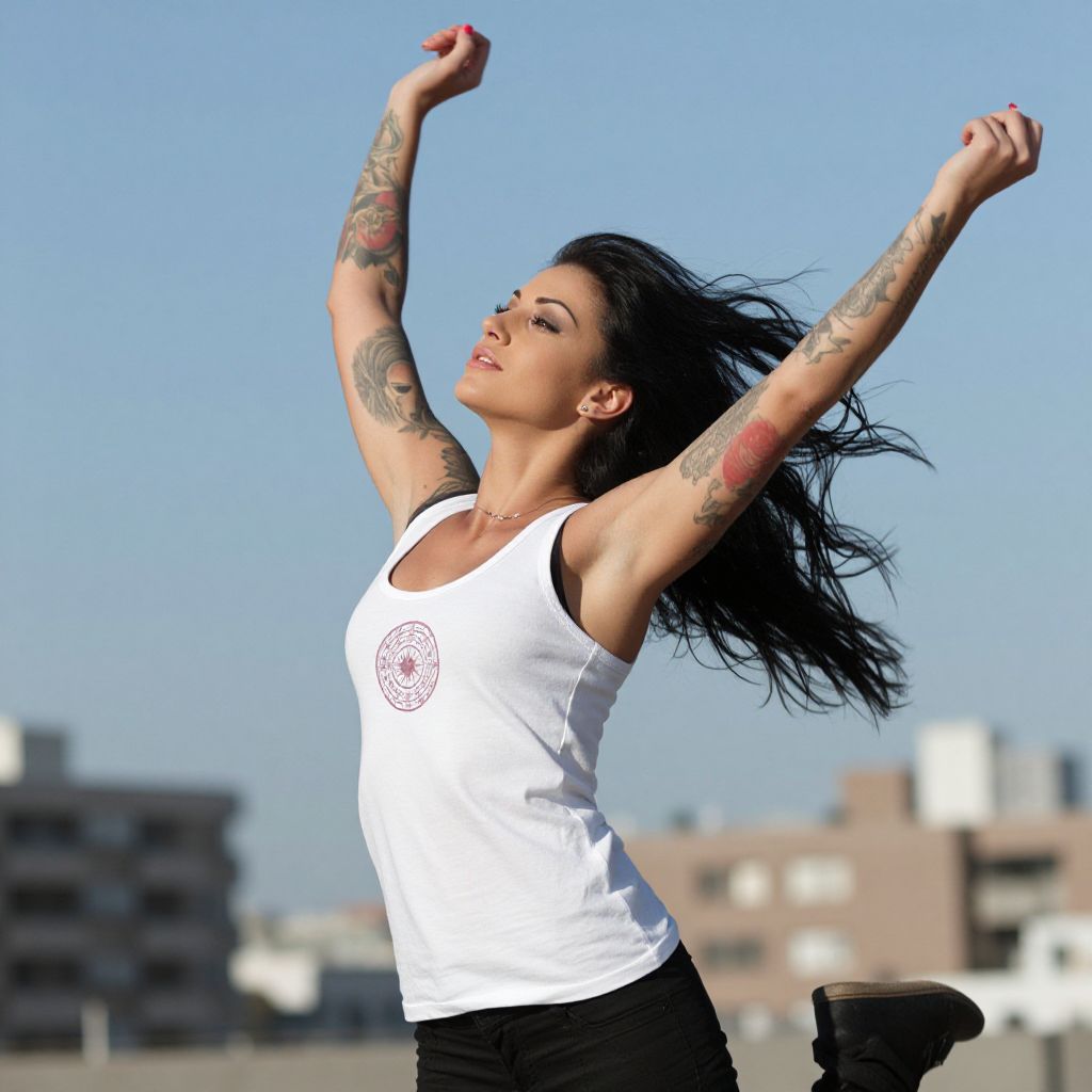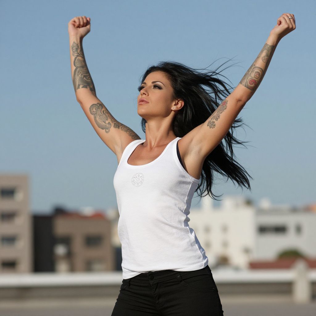 Photograph of a tattooed woman with long black hair flying in the wind. She's wearing a white tank top with a circular design on her chest and black pants. Her arms are raised, showcasing detailed arm tattoos. She's outside with a blurred urban background featuring buildings and a clear blue sky. Her expression is confident and she looks upward, enjoying the wind.