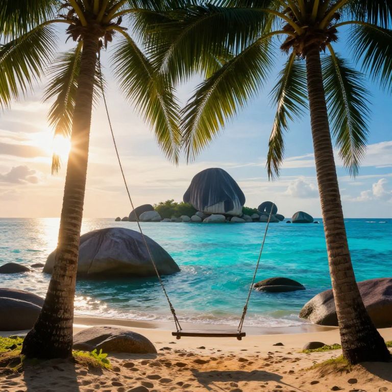 The sun has risen and casts its sunrise light at the picturesque besch of Koh Yao Noi island, between two giant palms, a hanging swing invites to linger, I return with the same fervor as before, my soul as joyful as ever, Joy surrounds me from every corner to see this impressive sight, An amazing view of the surrounding Boulders rising out of the water, rich and complex oil painting of sounds, a living tapestry woven from the hues and textures captured by a digital, double exposure, whimsical, fantastic, maximalist style, psychedelic, post-apocalyptic, photorealistic, concept art, sharp focus, harmony, serenity, tranquility, mysterious glow, ambient occlusion, halation, cozy ambient lighting, dynamic lighting, liiv1, linquivera, metix, mentixis, highest aesthetics, strong muted Highlighter of the turquoise ocean around, Blue hue, mystical glowing, best quality sharp focus, high contrast, stylized, clear, colorful, surreal, anime, cyberpunk