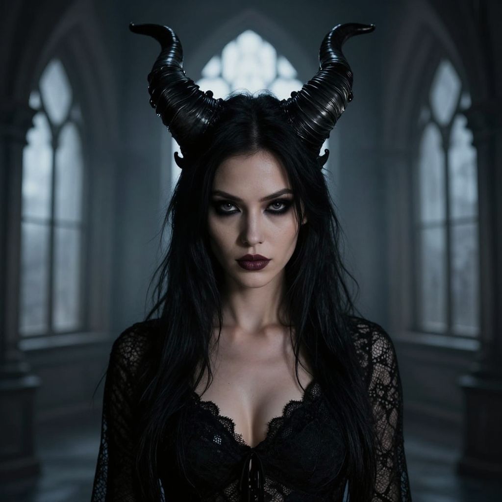 Digital art of a dark-haired woman with large, curling black horns. She has pale skin and intense, shadowed eyes. She's wearing a black, low-cut lace top that reveals some cleavage. The background is a dimly lit, gothic-style room with arched windows. The overall mood is mysterious and slightly eerie, with a focus on her striking horned headpiece and serious expression.