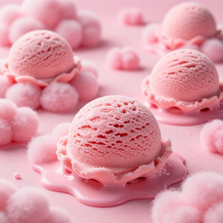 Photograph of pink ice cream scoops, melting with creamy drips, surrounded by fluffy pink sugar crystals, creating a soft, dreamy texture.
