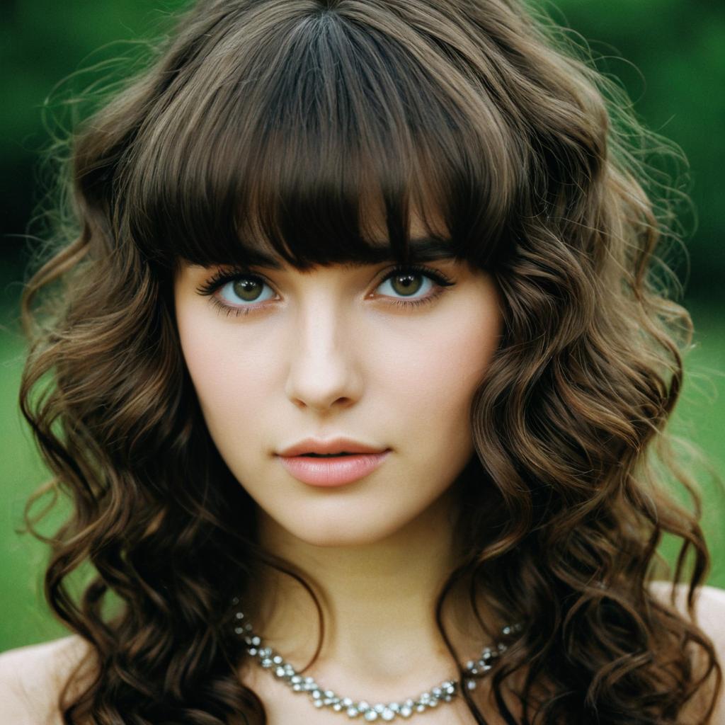 Close-up portrait of a young woman with long, wavy, and curly brown hair featuring bangs. She has green eyes, natural makeup with soft pink lips, and is wearing a delicate silver necklace. The blurred green background emphasizes her facial features and hair texture.