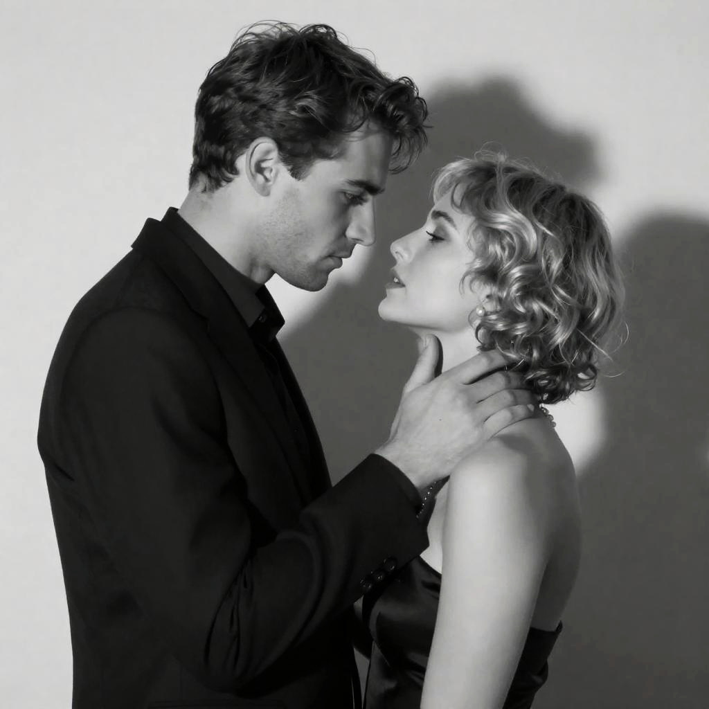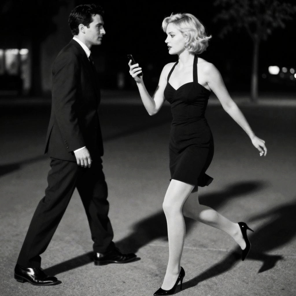 Black-and-white movie poster. Woman in black dress and white stockings, short blonde hair, mid-stride, right, holding phone. Man in dark suit, left, partially obscured. Nighttime urban setting, shadows, ground ure, trees in background. Two people, dynamic pose.