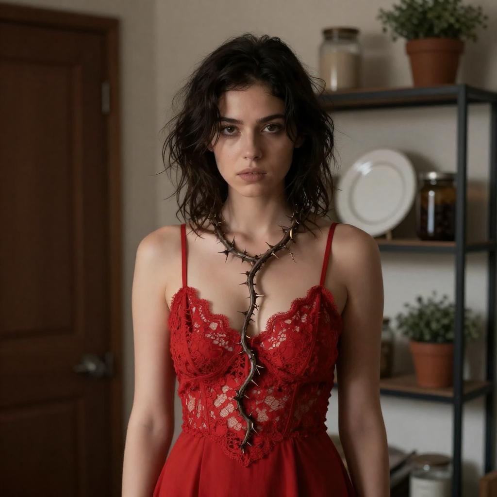 Portrait of a woman with dark hair styled in an updo, medium skin tone, wearing a lavender satin corset with lace trim, standing between vertical black metal bars in a dimly lit indoor setting. She has a serious expression, and her right hand rests on one of the bars. The background features muted-colored walls and curtains, creating a soft, intimate atmosphere.