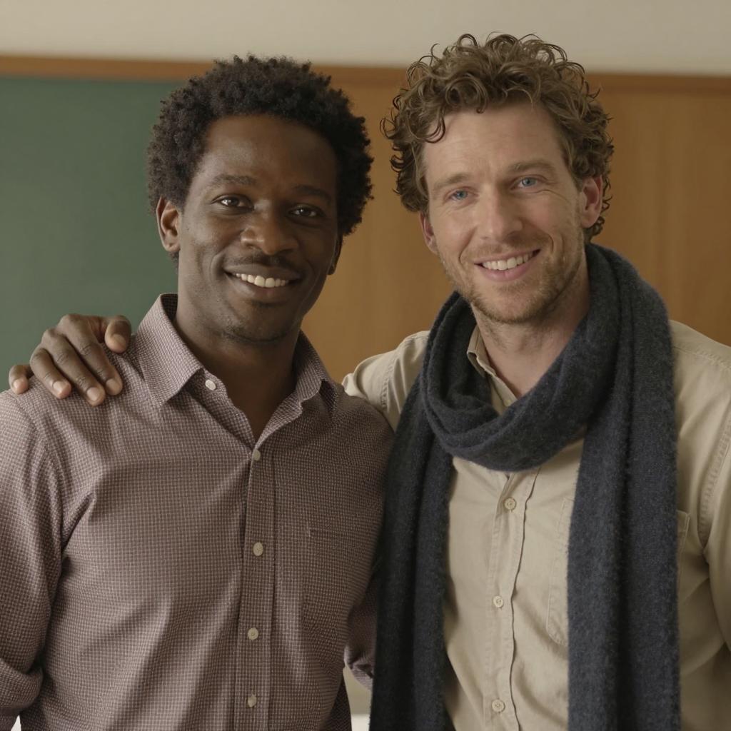 Two men standing close together. Black man on left with dark skin, short afro, smiling, wearing a brown checkered shirt. White man on right with light skin, curly brown hair, smiling, wearing a beige shirt and dark scarf. Background includes blurred green and brown objects. Black man's right arm around white man's shoulder. White man's left hand on Black man's shoulder.