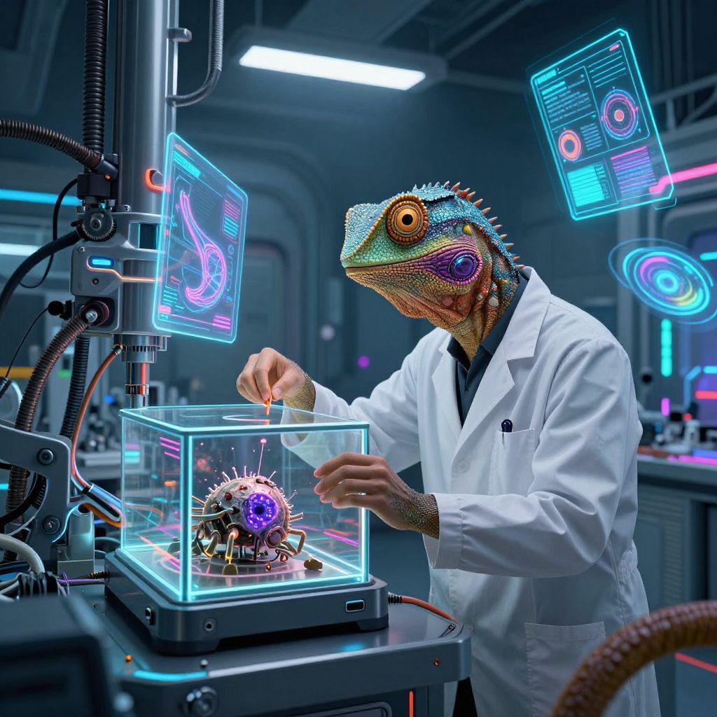 Reptoid Scientist in Cyberpunk Lab