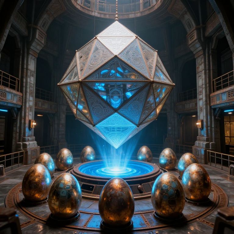 The image presents a dramatic, low-angle view of an underground research facility, dominated by a 4-meter-tall, opalescent icosahedron Mana battery. This intricate, geometric structure, with its 20 triangular faces, is suspended above a central pool of glowing blue light, creating a mesmerizing focal point. The Mana battery is adorned with complex, interwoven arcane runes, adding a layer of mystique and power to the scene. Surrounding the Mana battery are 10 Faberge eggs, each weighing 500 pounds, arranged in a circular pattern on the mechanical floor. The eggs, with their glossy, reflective surfaces, contrast sharply with the rough, rusted textures of the surrounding environment. The facility itself is a labyrinth of stone pillars and metal railings, leading the eye upwards towards the glowing Mana battery. The interplay of light and shadow, combined with the detailed textures and vibrant colors, creates a sense of depth and mystery, inviting the viewer to explore the secrets hidden within this ancient research facility.