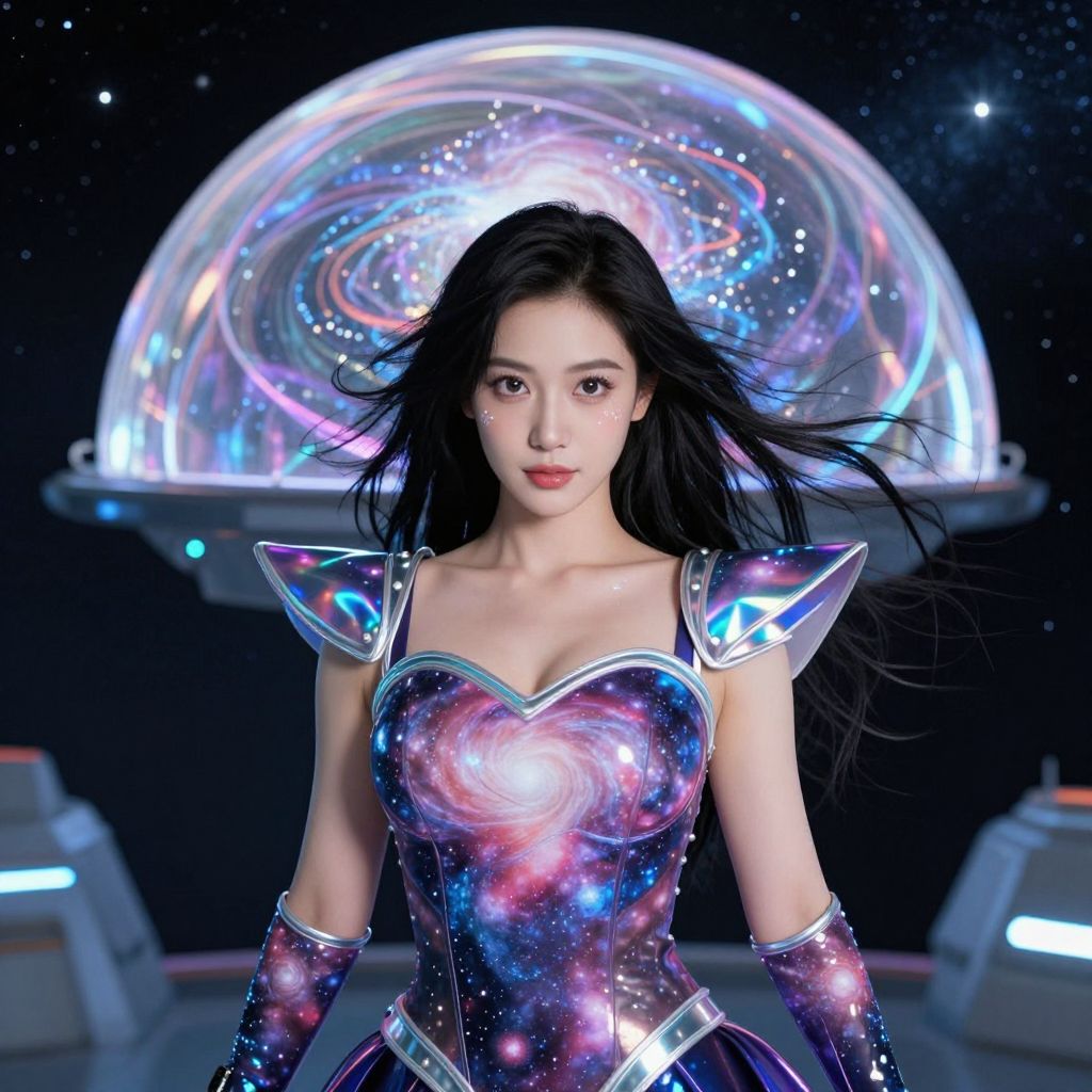 A mysterious woman in a dazzling Galaxy Queen costume with bold, space-themed holographic elements — such as spiral galaxies and nebula patterns — stands beneath a massive holographic dome in a futuristic space colony, the lights pulsing in rhythm with her movements, her face has a soft glowing complexion, long black hair flowing in the wind, and a knowing, powerful expression as the stars around her shift and swirl.. The woman has big tits and cute face