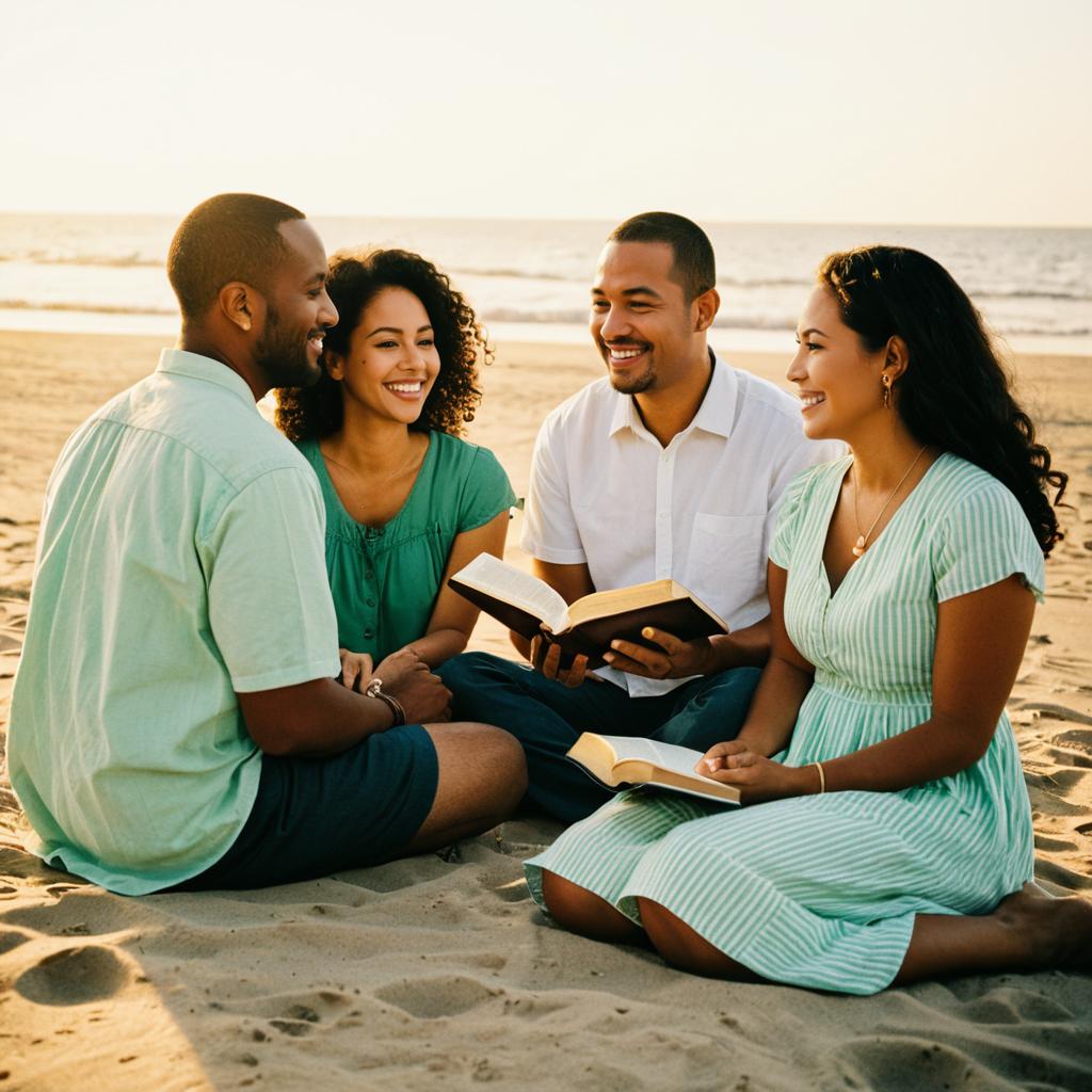Glow of an ethnically diverse group, including Mixed-race couples, of three friends in their mid thirties sitting together on a beach studying the bible. Wearing modest American summer clothing. Slight breeze. Happy uplifting. Golden hour with a mint green. Photorealistic image.