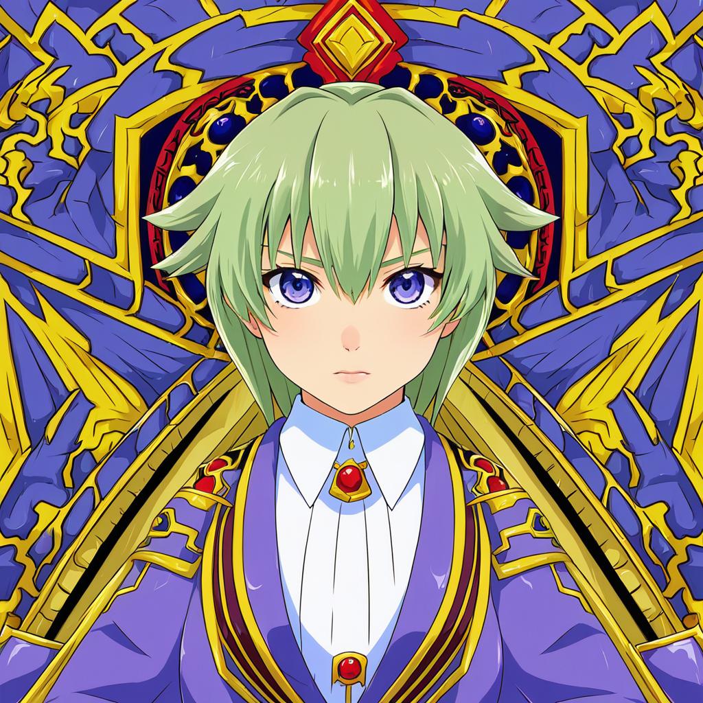 This digital anime-style drawing features a young male character with light green, slightly tousled hair and striking purple eyes. He wears an elaborate royal blue and gold robe adorned with intricate patterns and red gemstones. A white shirt with a high collar and a red gem at the center of his chest stands out. The background is a vibrant, ornate design with blue and gold motifs, resembling a regal coat of arms. His expression is neutral, and he is centered in the image, with the detailed background framing his upper body. The art style is colorful and highly detailed, with a focus on symmetry and regality.