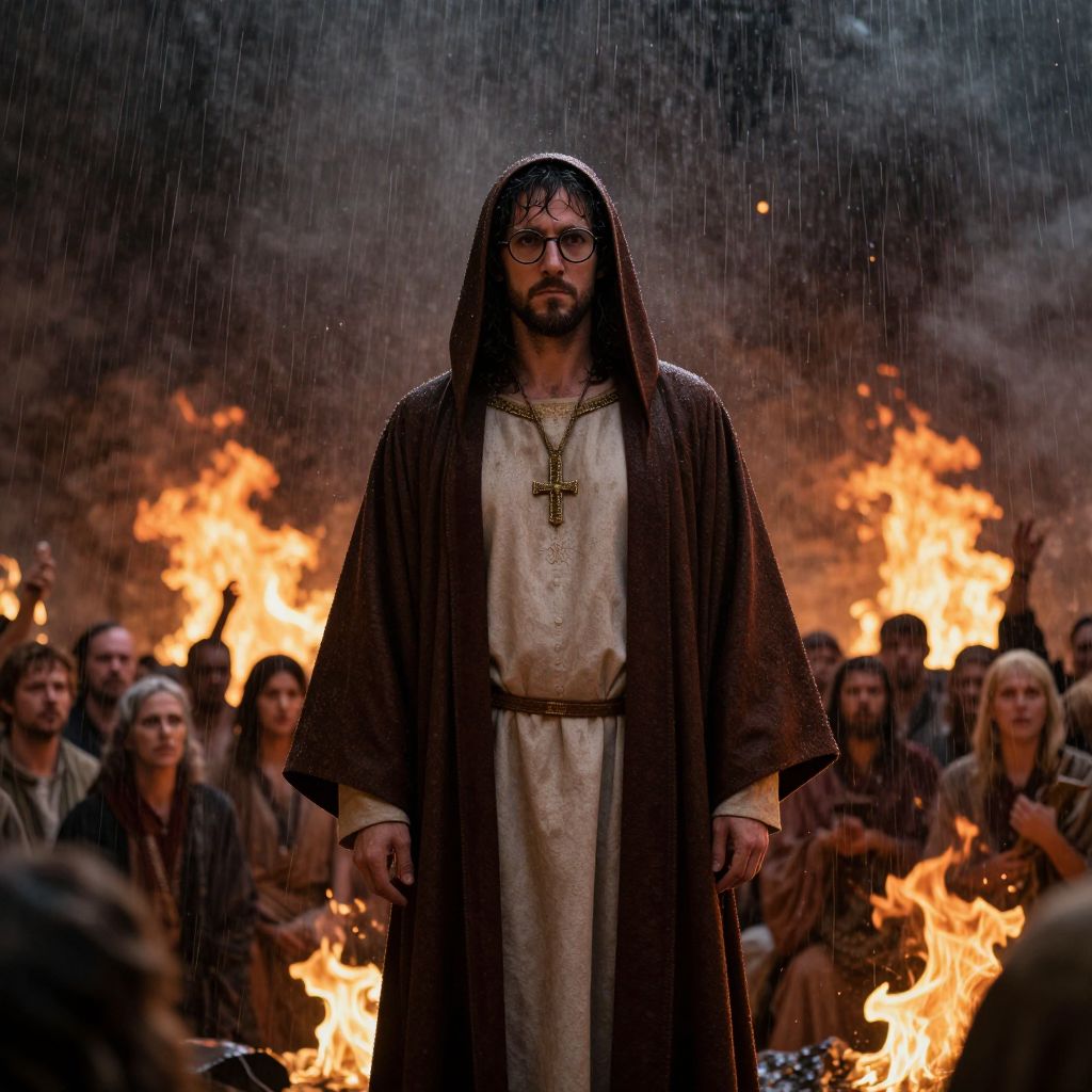 A man in a robe and glasses stands in the center of a crowd, with flames and rain in the background, evoking a sense of ominous, biblical violence.