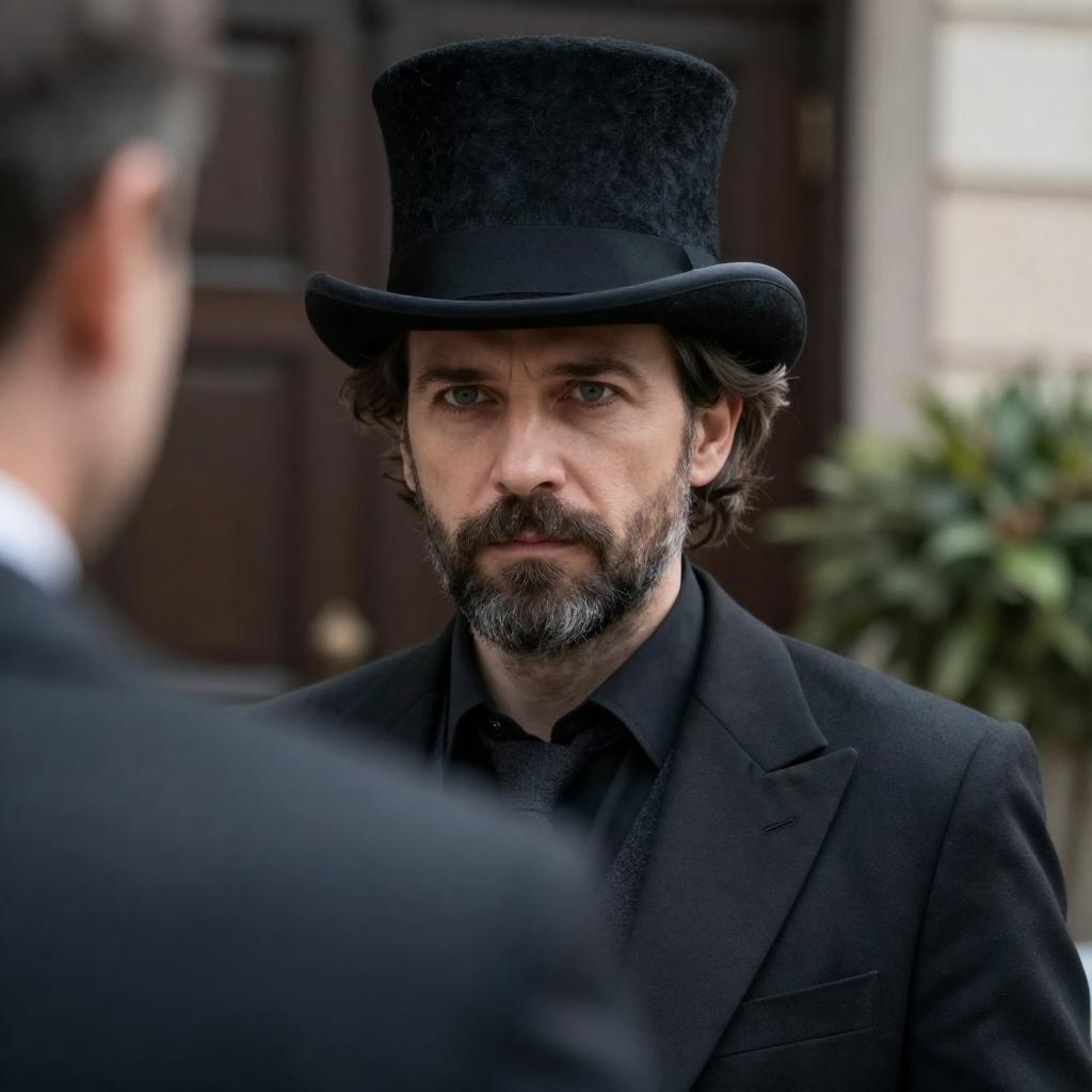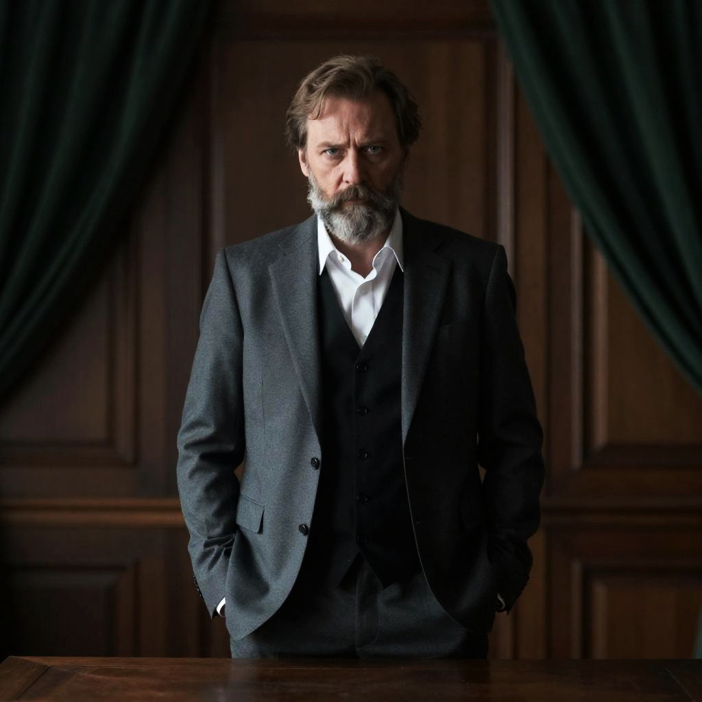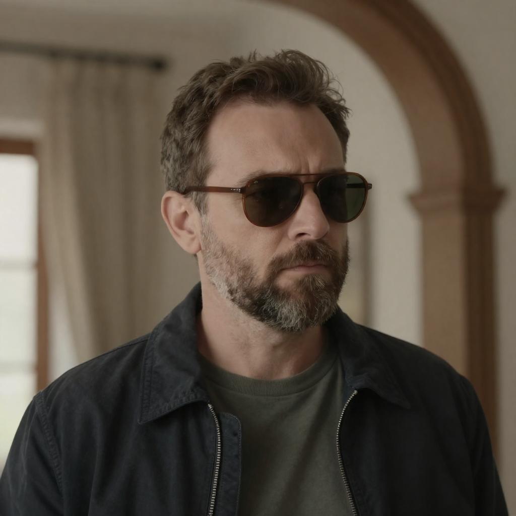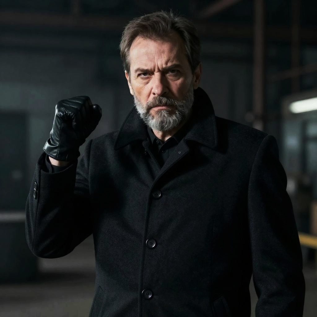 Middle-aged man with disheveled brown hair and beard, wearing a dark jacket, lying on the floor and gripping a metal pole. His face shows intense concentration. Blurred background with vertical columns. Hand of another person holding a pole.