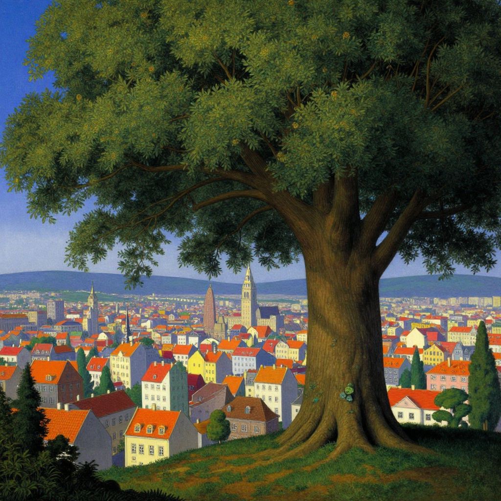 Envision an enchanting landscape reminiscent of Magritte's captivating works, where a massive tree conceals a vibrant cityscape below. From an unconventional perspective, witness this perplexing tableau as it masterfully juxtaposes the raw beauty of nature with the intricate web of human creation, sparking both curiosity and longing for times past. The vivid hues and ethereal ambiance in this scene create a mesmerizing visual narrative that challenges the viewer's perception of reality, inviting them to delve deeper into its enigmatic depths.