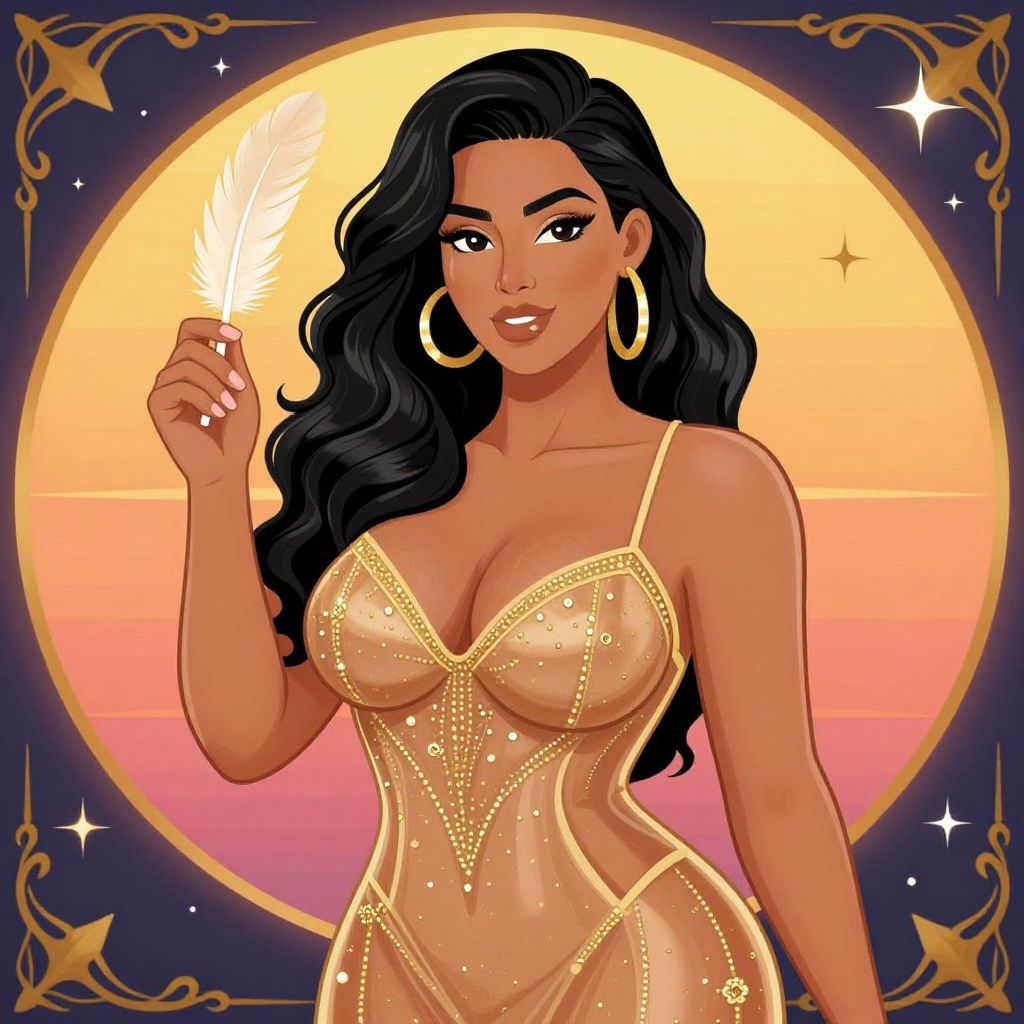 This is a colorful digital illustration of a confident woman with long, wavy black hair and medium skin tone. She's wearing a sheer, gold-embellished, spaghetti-strap dress that highlights her curvy figure and medium-sized breasts. She's holding a small feather in her right hand, with a slight smile on her face. She's accessorized with large gold hoop earrings. The background features a circular, sunset-colored gradient with star patterns and ornate golden designs.
