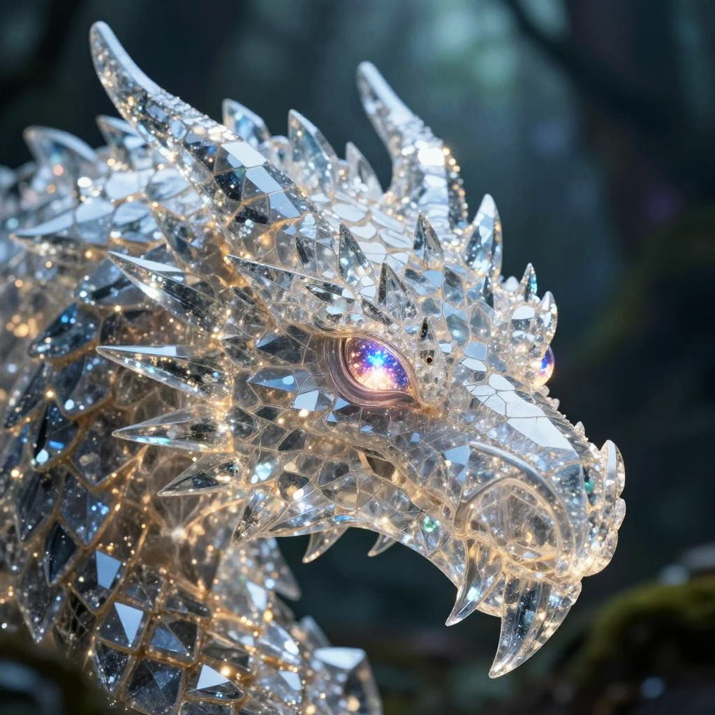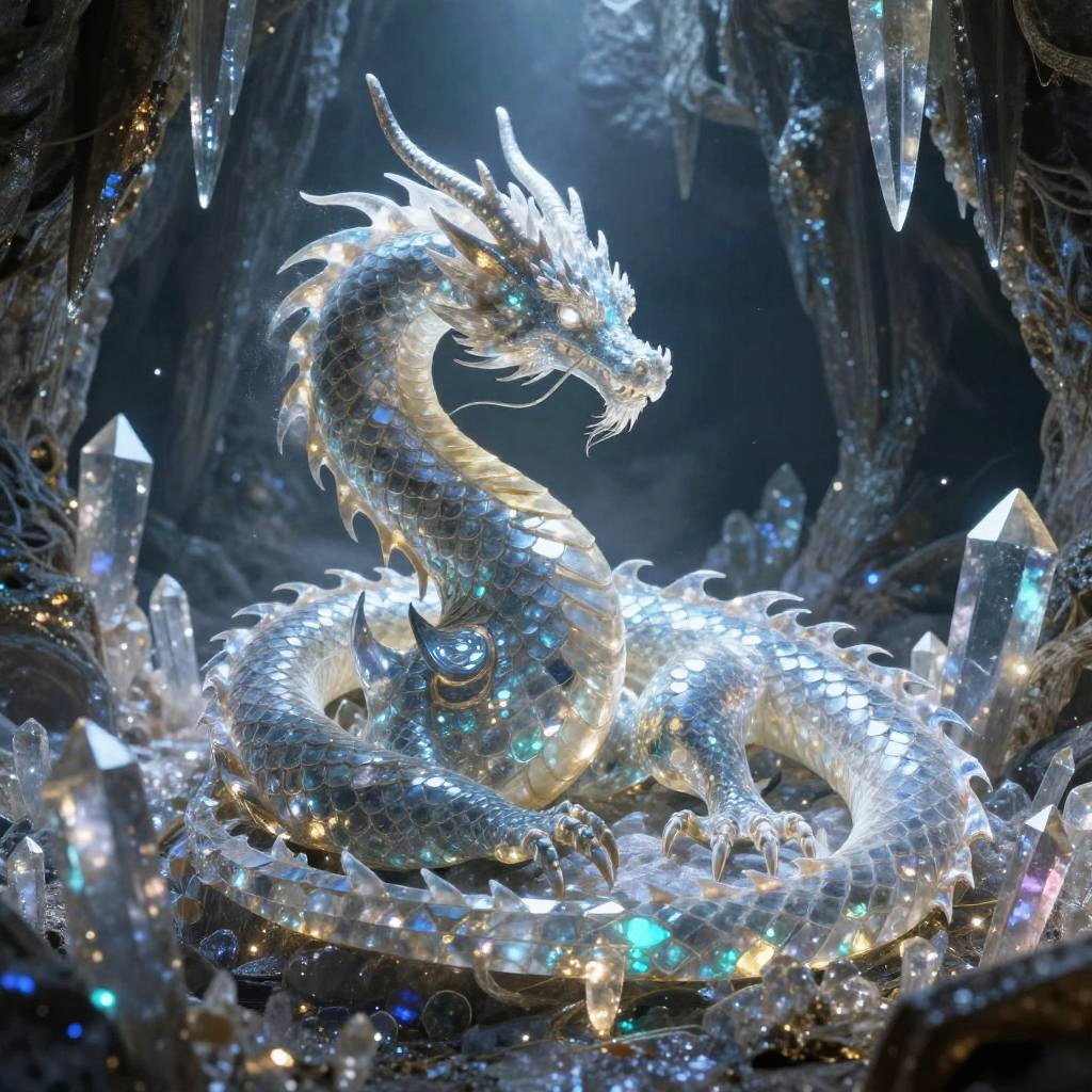 Ancient cristal dragon resting in a cavern of luminous crystals, scales blending seamlessly with glowing stalactites, a mystical aura surrounding its elegant, ethereal form
