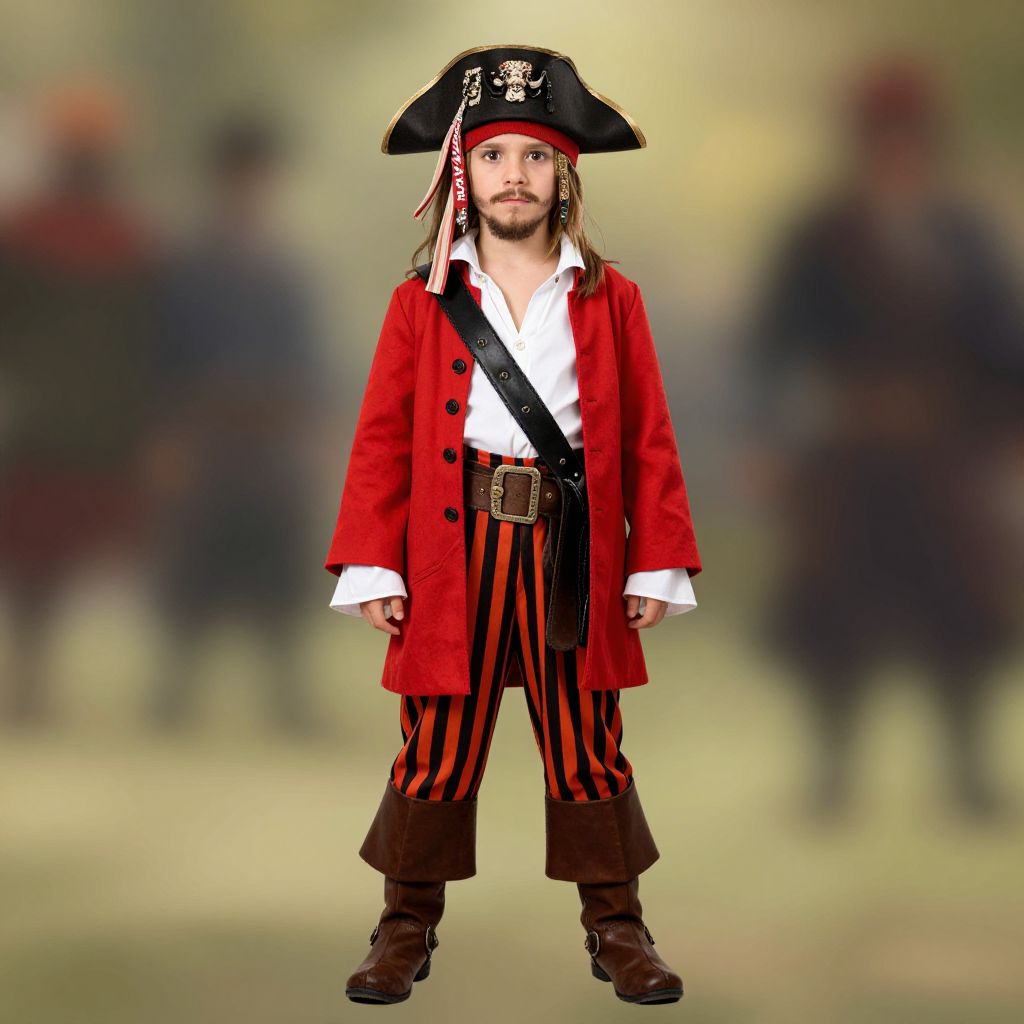 Pirate costume red, 1boy, pirate, male focus, hat, facial hair, pirate hat, solo, boots, pants, beard, shirt, standing, striped pants, white shirt, coat, looking at viewer, long sleeves, brown footwear, blurry background, full body, blurry, striped clothes, belt, open clothes, mustache