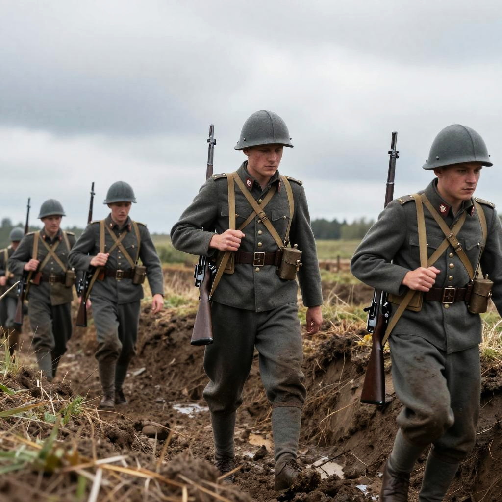 WW1 Austrian uniform group of infantrymen marching through muddy trenches, overcast sky, authentic period details with rifles and gear, realistic lighting emphasizing war-time hardship and camaraderie