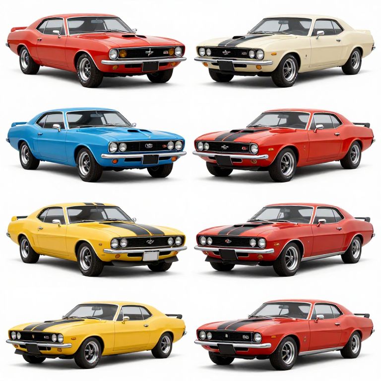 Six classic muscle cars from the 1970s and early 1980s are showcased in a grid layout, featuring vibrant colors, bold stripes, and iconic designs that epitomize American automotive culture.