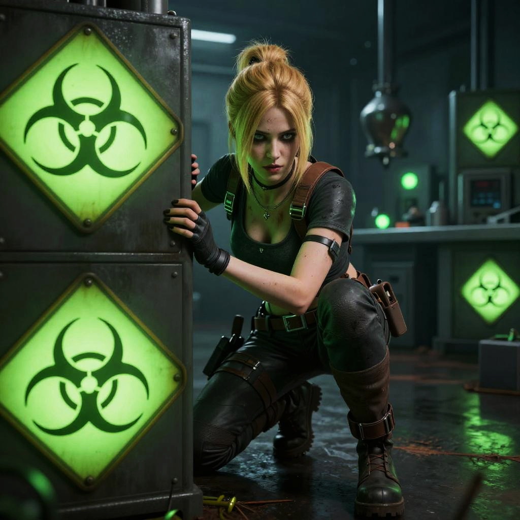 Blonde girl from Resident Evil, stealthy and alert, crouching behind cover in a creepy laboratory, green glowing biohazard signs, horror sci-fi vibe, ultra detailed character portrait