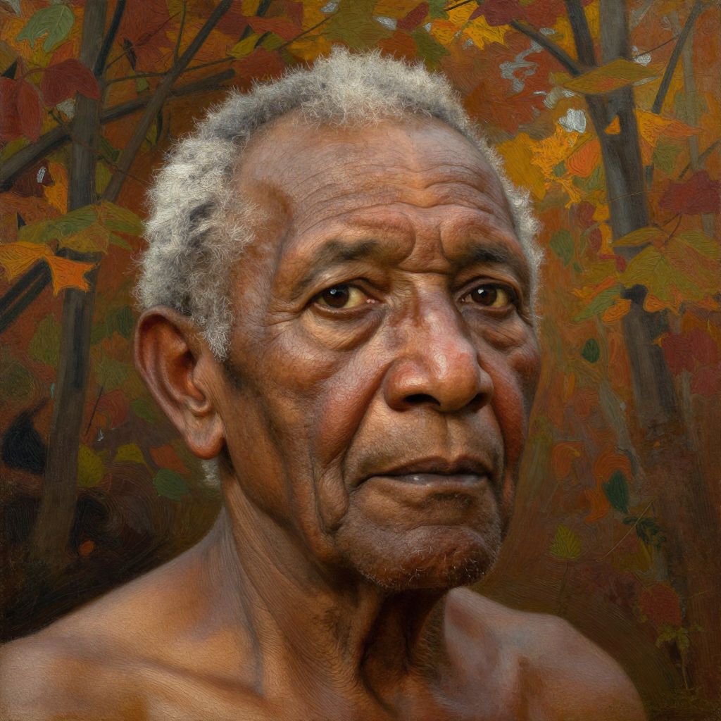 Digital painting of an elderly, shirtless man with wrinkled, dark brown skin, white curly hair, and expressive eyes, set against an autumn forest